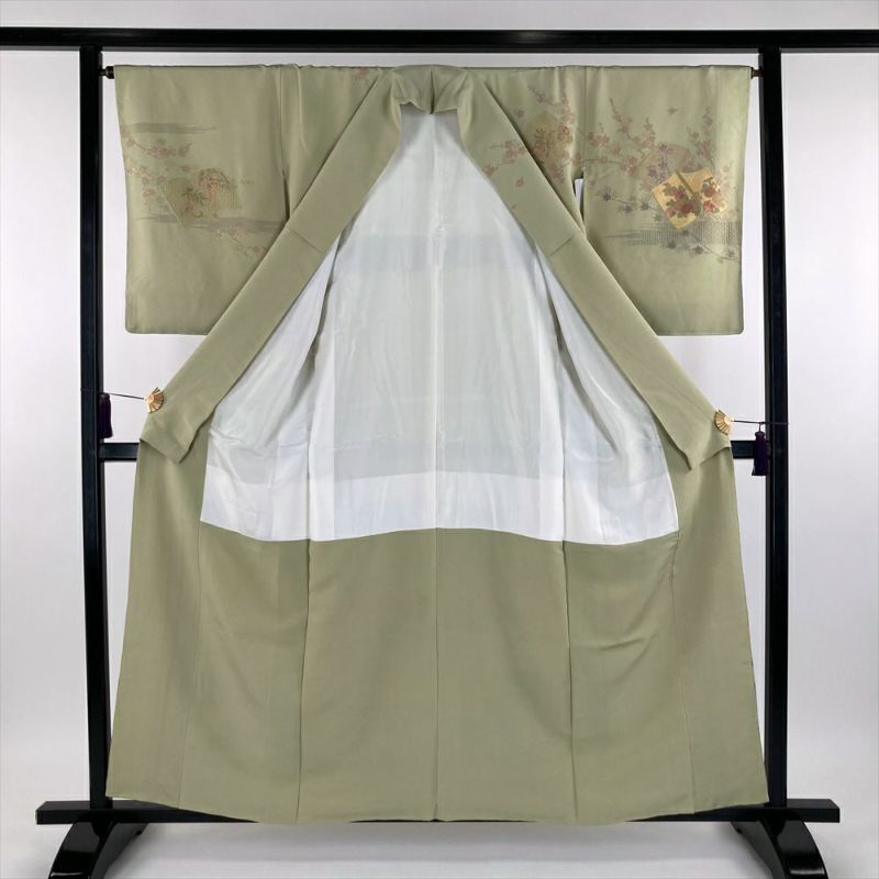 (中古) 訪問着 黄緑 若芽色 ライムグリーン色 セミフォーマル ちりめん 染め 金彩 刺繍 袷 S【身丈】155.5cm【裄丈】67cm