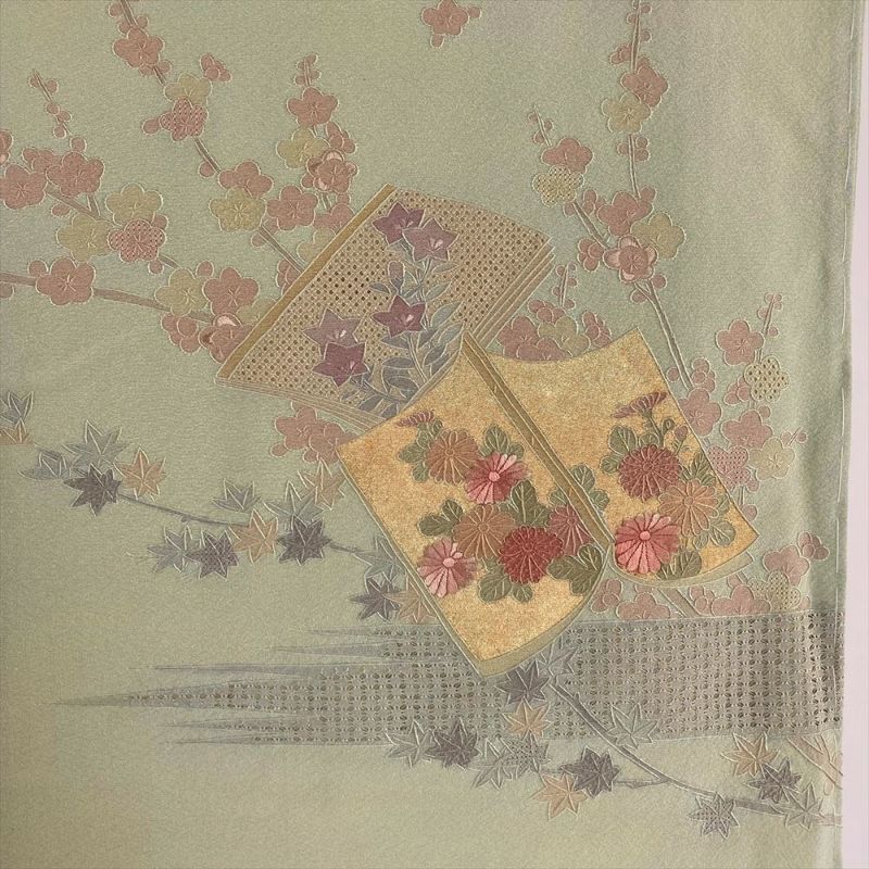 色柄: 若芽色(芽吹いたばかりの若葉のような、淡く柔らかな黄緑色)に、冊子文(和綴じの本を文様化したものです)優美さや華やかさだけでなく、知性を表現しているように感じられます。