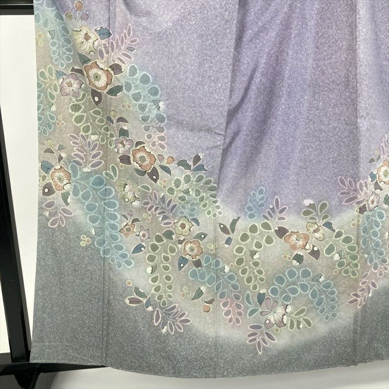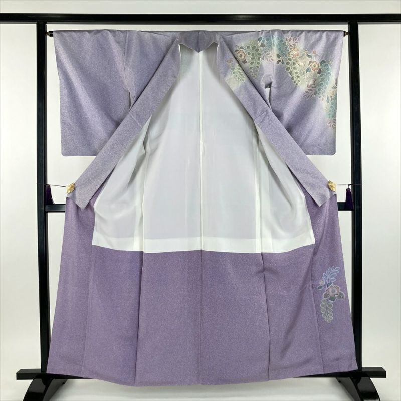 染め:藤紫色は、藤の花の色を思わせる、上品で美しい紫色です。明るい青みがかった紫色で、日本の伝統色の一つとして古くから愛されてきました。袖や裾には、柔らかな印象のぼかし染めが広がります。