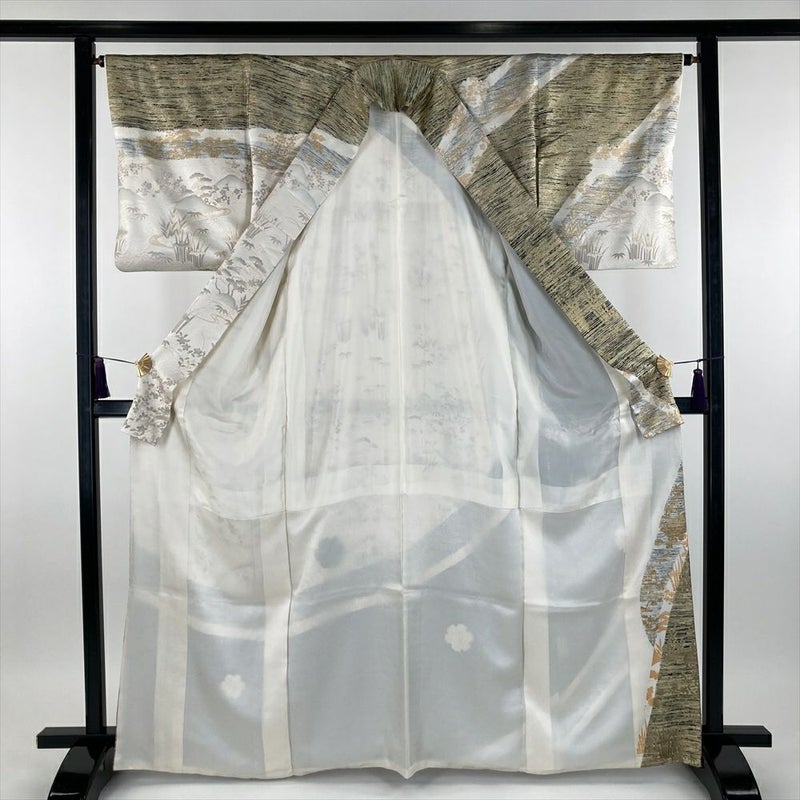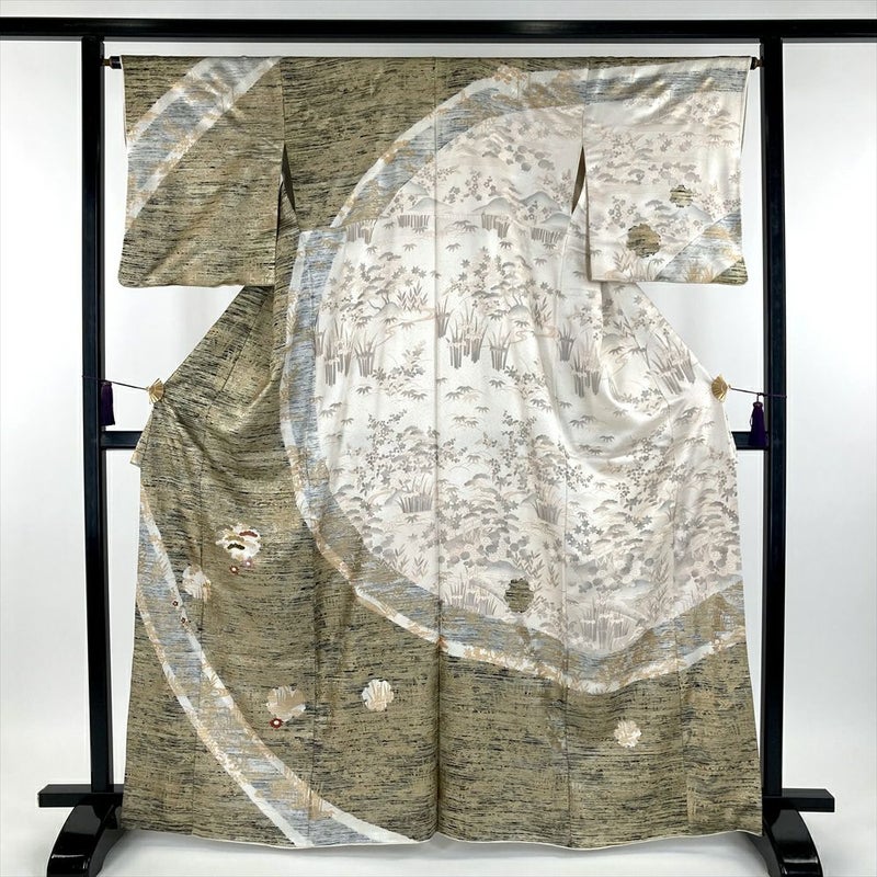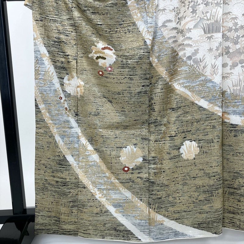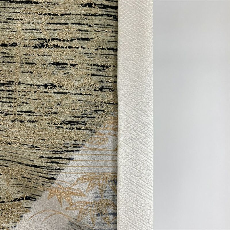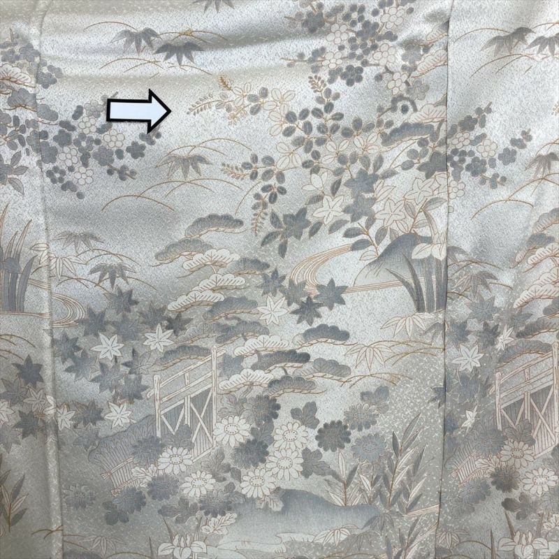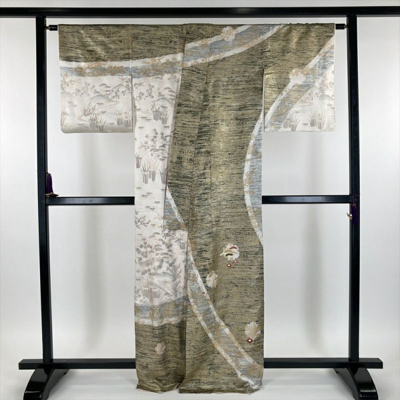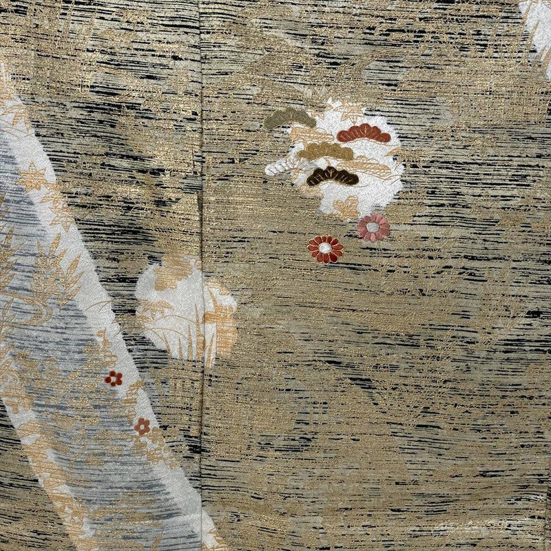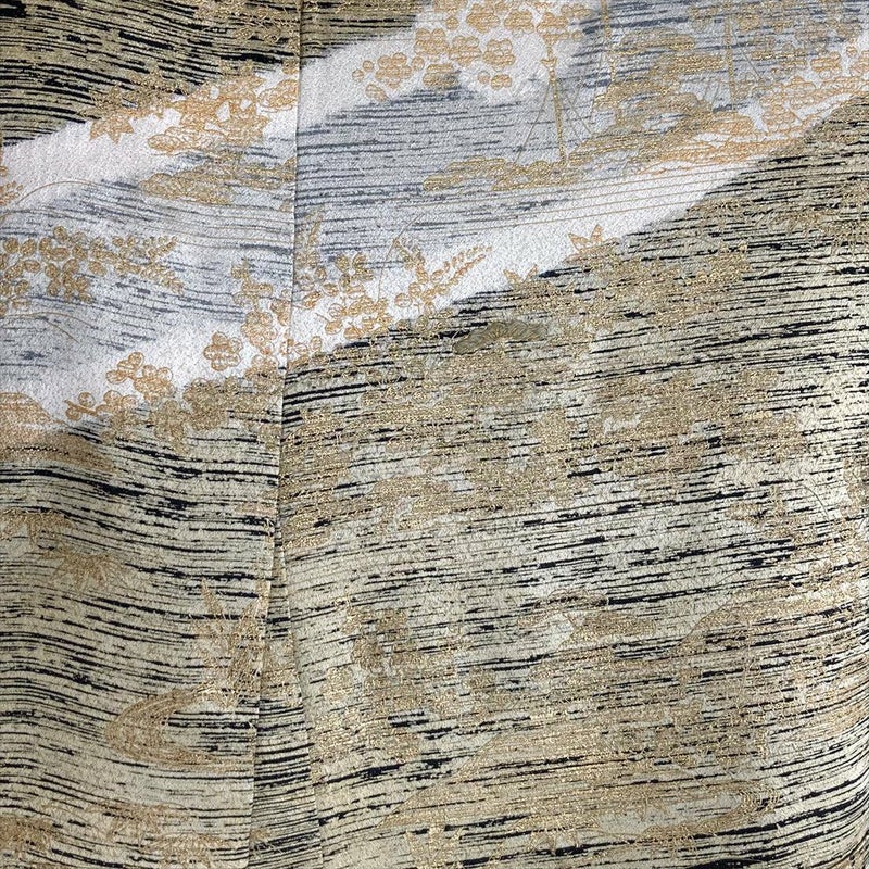 柄:金彩をふんだんに使い、描かれているのは、江戸解き模様(流水や家屋、草花などを組み合わせて、まるで屏風絵のような風景を描いたような模様)です。江戸解き模様は、江戸時代の女性たちの美意識を反映した、華やかで美しい着物模様です。現代においても人々を魅了し続けています。