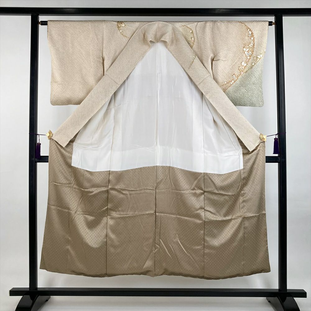 (中古) 訪問着 薄茶 薄緑 ベージュ セミフォーマル 染め 総絞り 鹿の子 袷 SS【身丈】145cm【裄丈】62.5cm