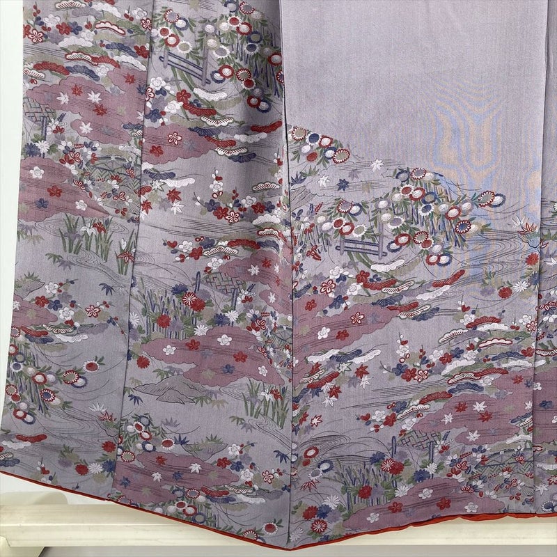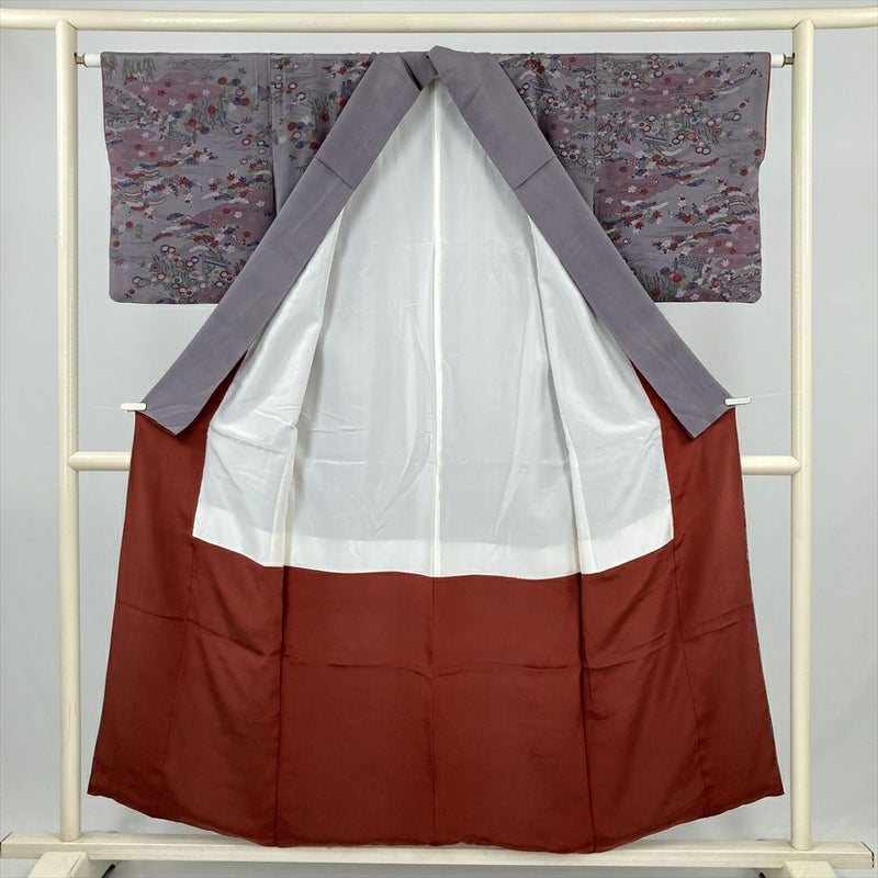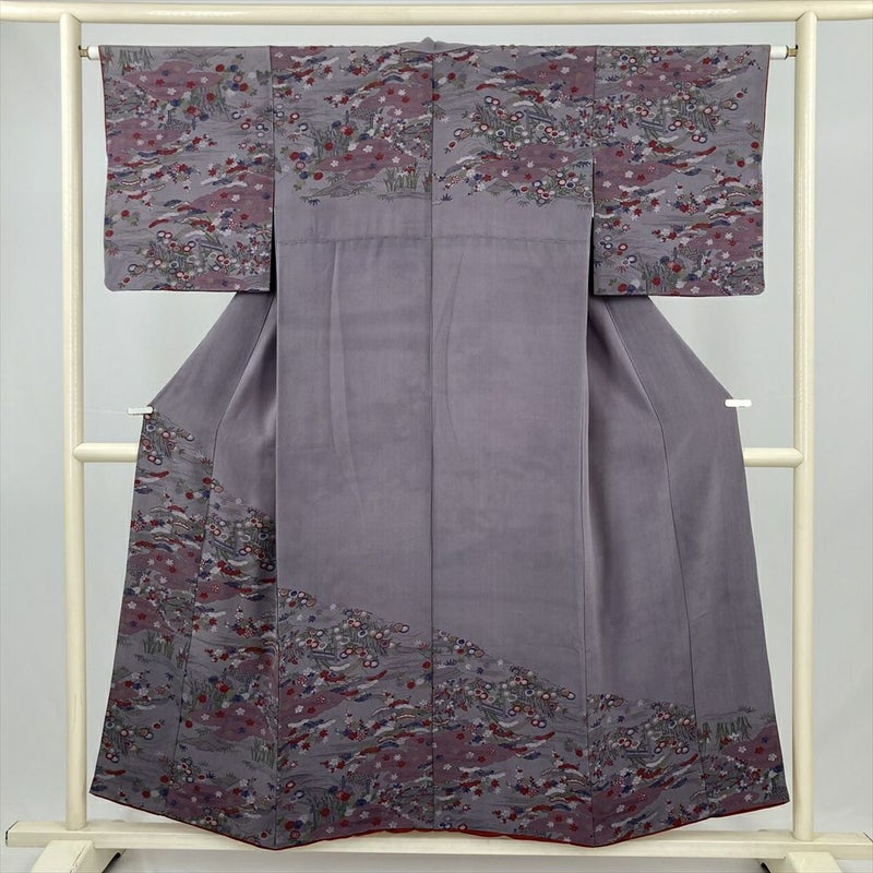 (中古) 訪問着 灰紫 ヴィンテージ 雲取り 水辺文 袷 絹【身丈】145.5cm【裄丈】63cm