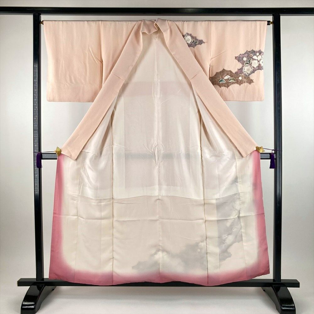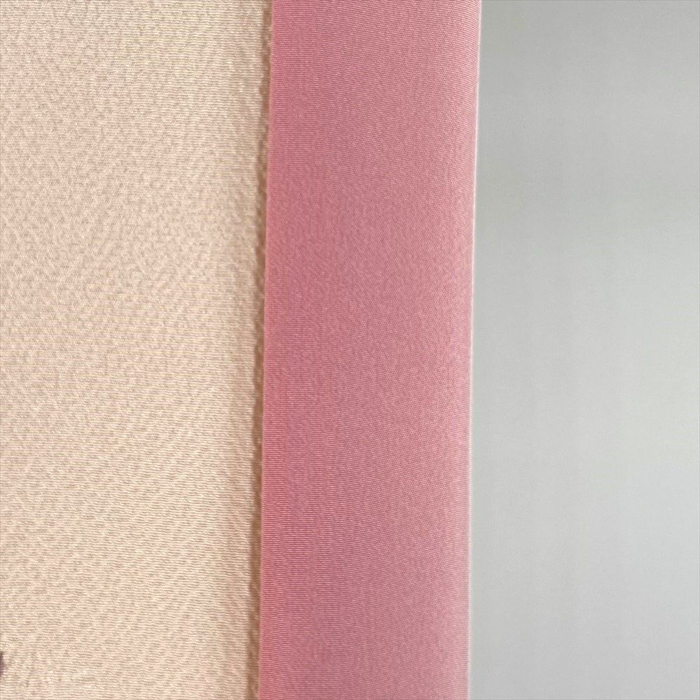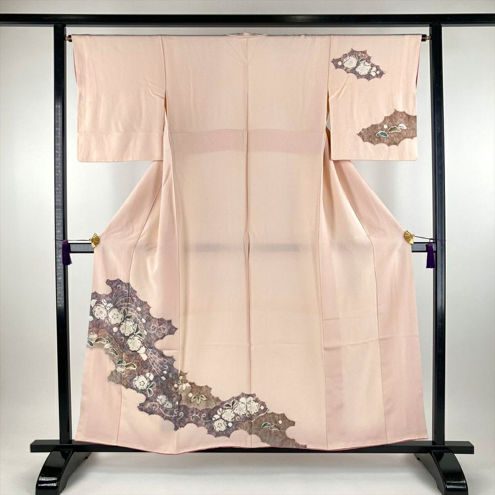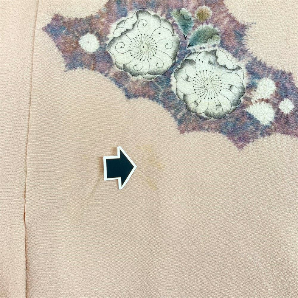 華やかさと繊細さ、生地を絞ることで生まれる立体感は「辻が花」独特の魅力です。ふっくらとした、ちりめん生地の凹凸の乱反射によって、染め上がりのピンクの色合いがより優しく豊かです。リユース品ですが、まだ十分ご愛用いただけると存じます。上前、左右後身、右後袖に茶色い汚れがございます。保存臭がややございます。