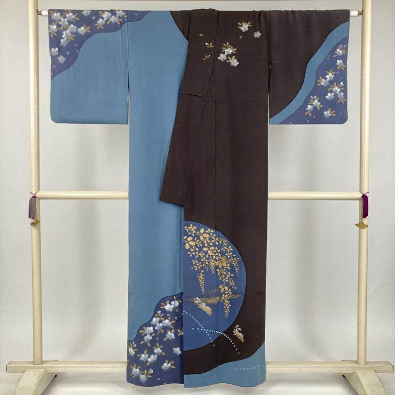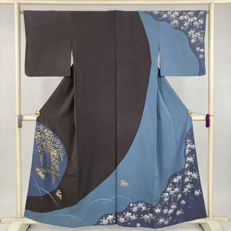 上質なちりめん生地に、手描きで丁寧に描かれた兎と萩。金彩と刺繍が施され、上品な華やぎを添える正絹のしゃれ訪問着です。ずっしりとした重厚感のある生地は、着る人に風格を与えます。