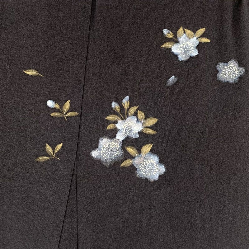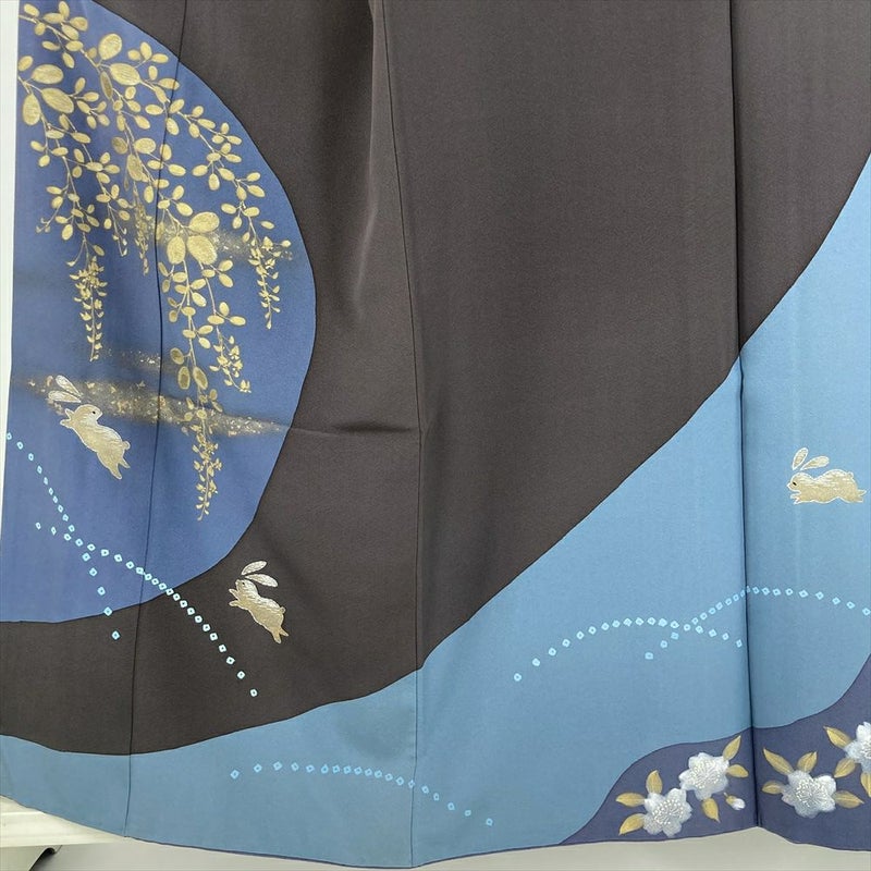 【色柄】灰茶 セミフォーマル ちりめん 染め 金彩 刺繍 桜 萩 兎