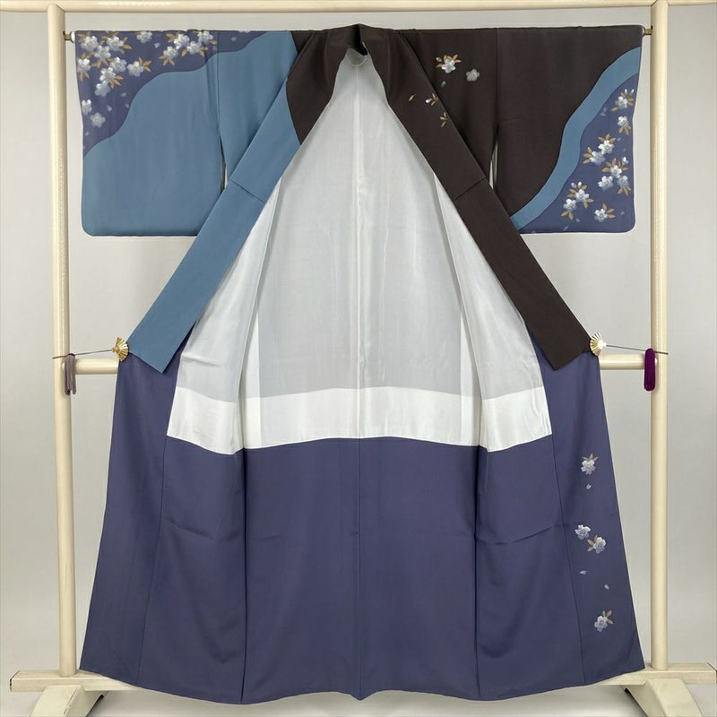 (中古) 訪問着 灰茶 セミフォーマル ちりめん 染め 金彩 刺繍 桜 萩 兎 袷 絹 【身丈】153cm【裄丈】66cm