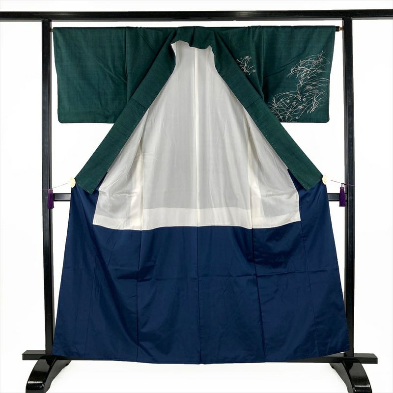 (中古) 訪問着 深緑色 カジュアル 紬地 銀彩 秋の草花 袷 S 【身丈】156.5cm【裄丈】66cm
