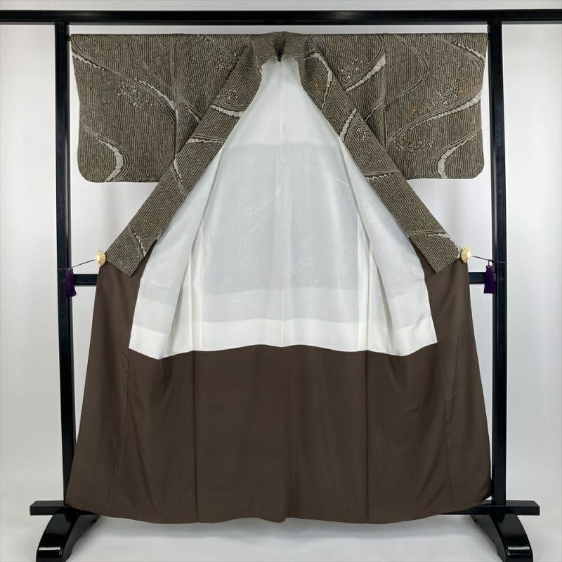 (中古) 付下 こげ茶 朽葉色 セミフォーマル 染め 絞り 金彩 刺繍 唐花 袷【身丈】156cm【裄丈】67.5cm