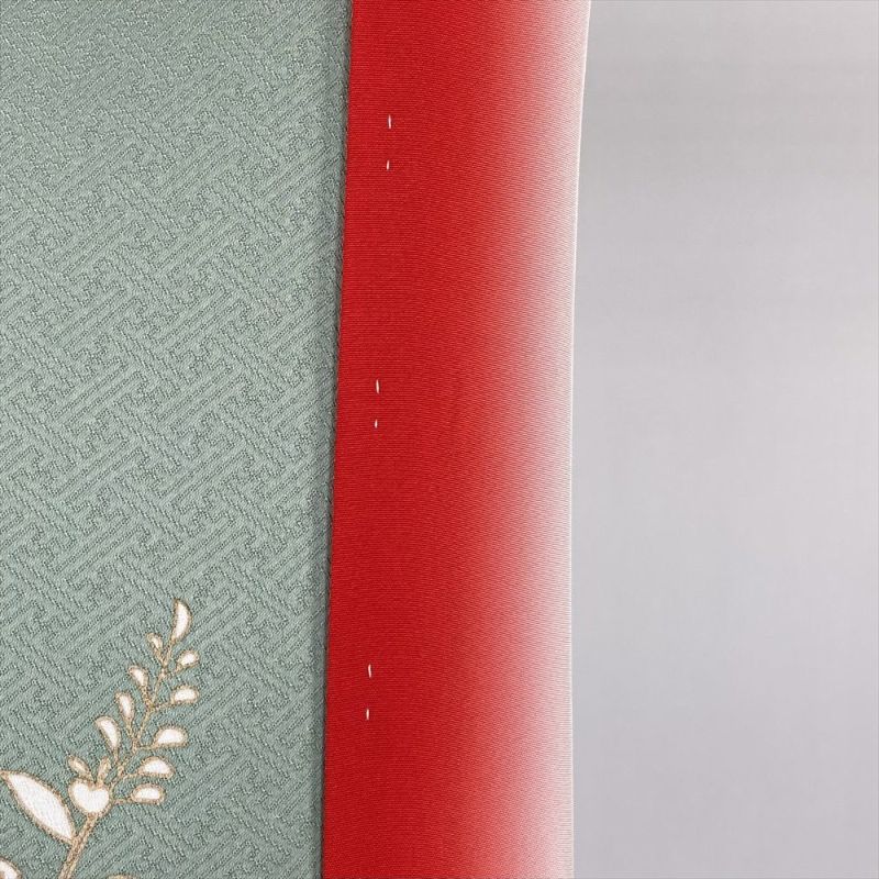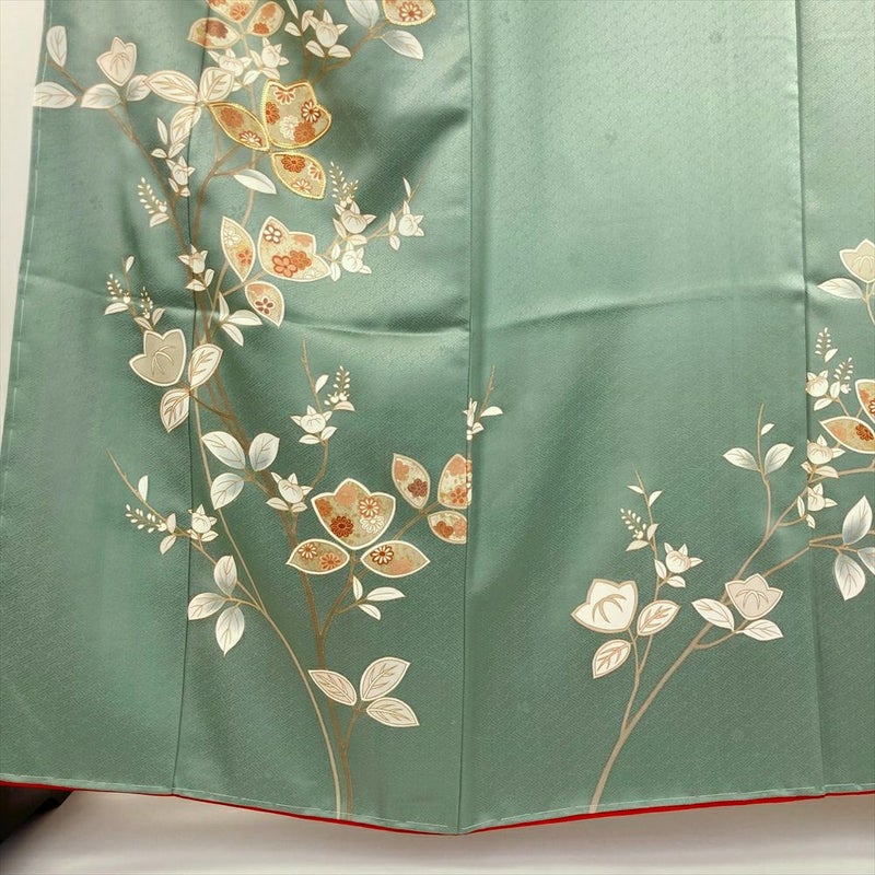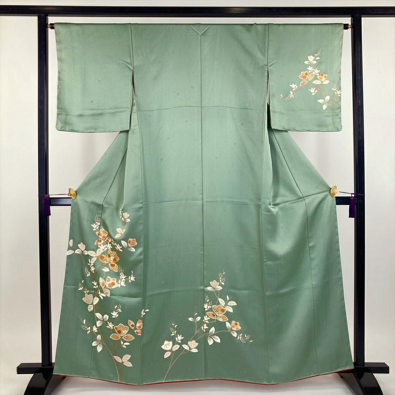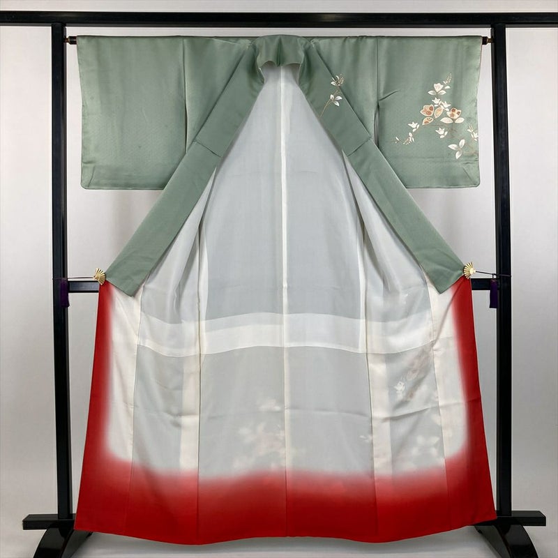 薄緑色の地に朱色の八掛が映える、どこか懐かしい趣の訪問着です。