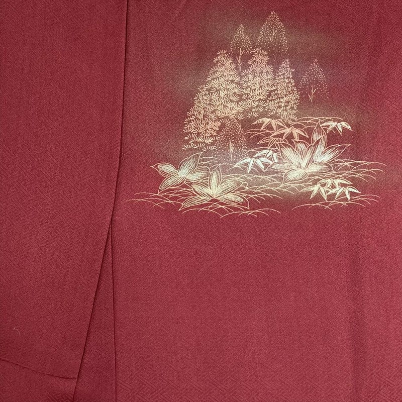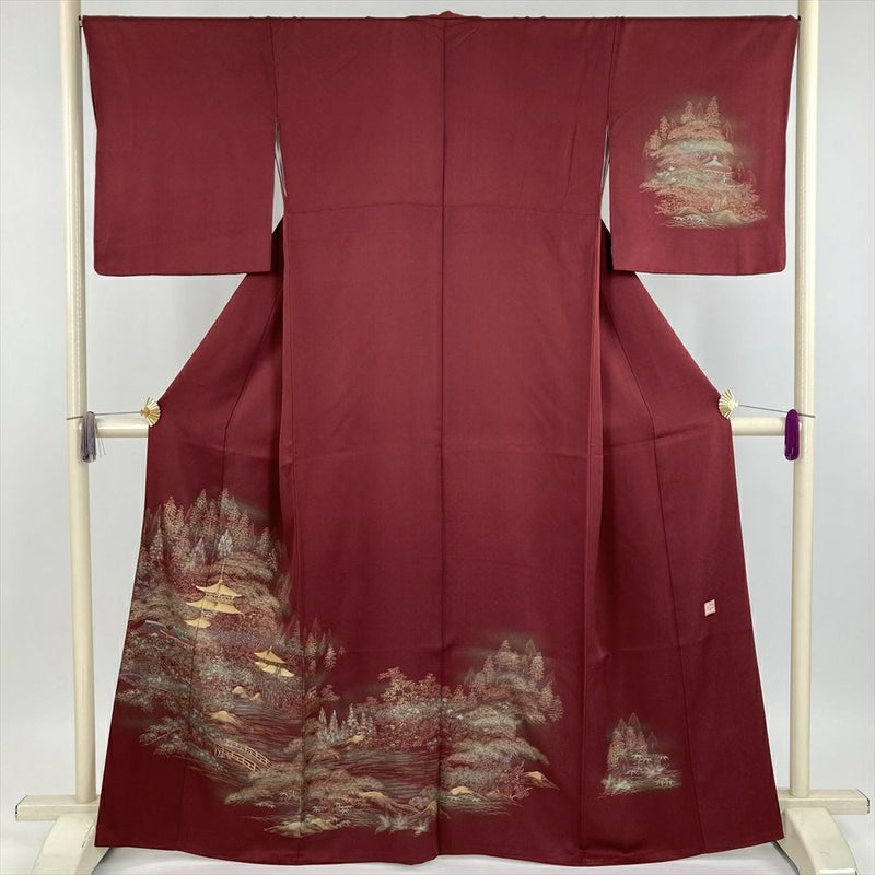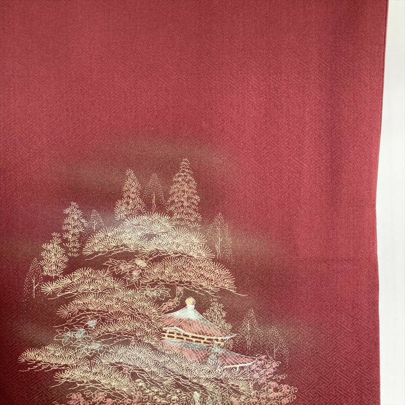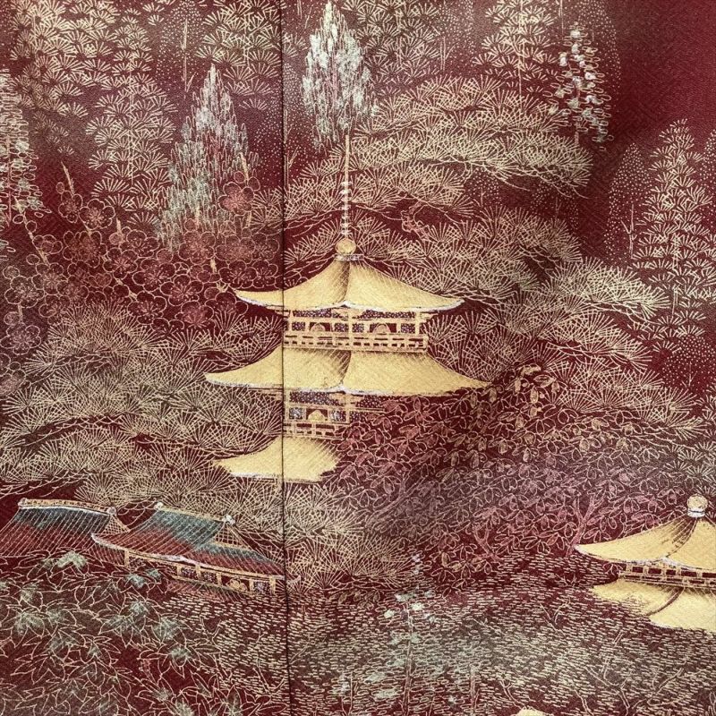 【色柄】臙脂色 深赤色 セミフォーマル 地紋織り 染め 金彩 古都の景色