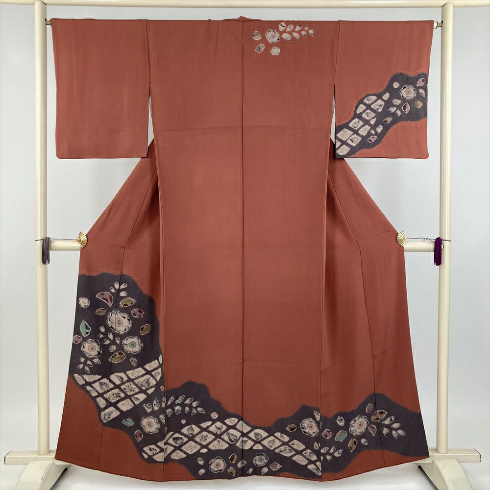 手描きの彩色と、丁寧な手仕事による絞り染めが、まるで生きた花のように、着物の上に咲き誇ります。
