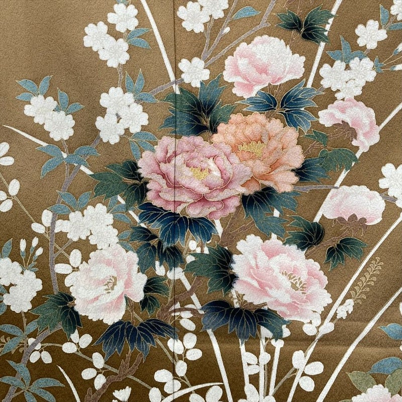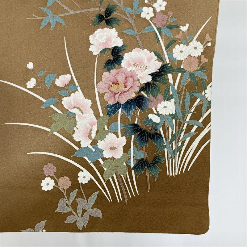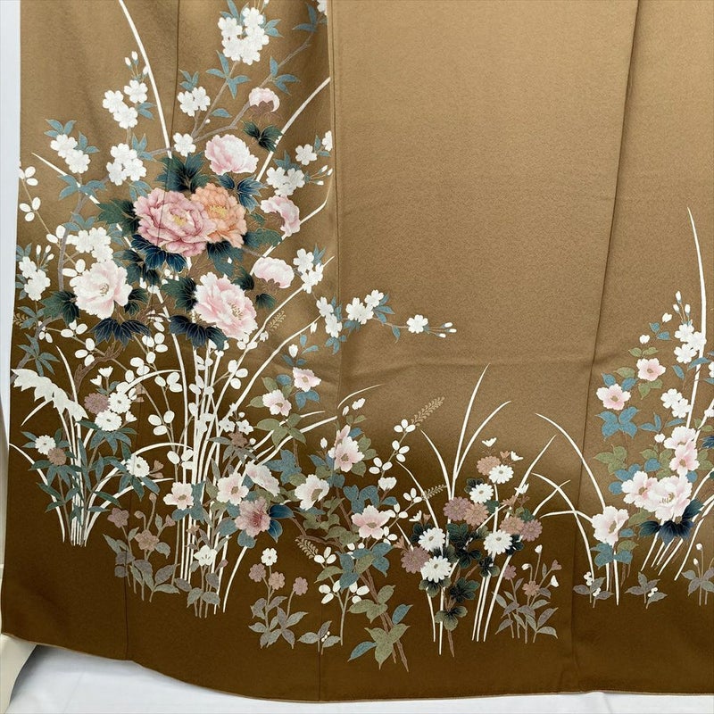 落ち着いた茶系の地色に、四季折々の花々が優雅に咲き誇る訪問着です。