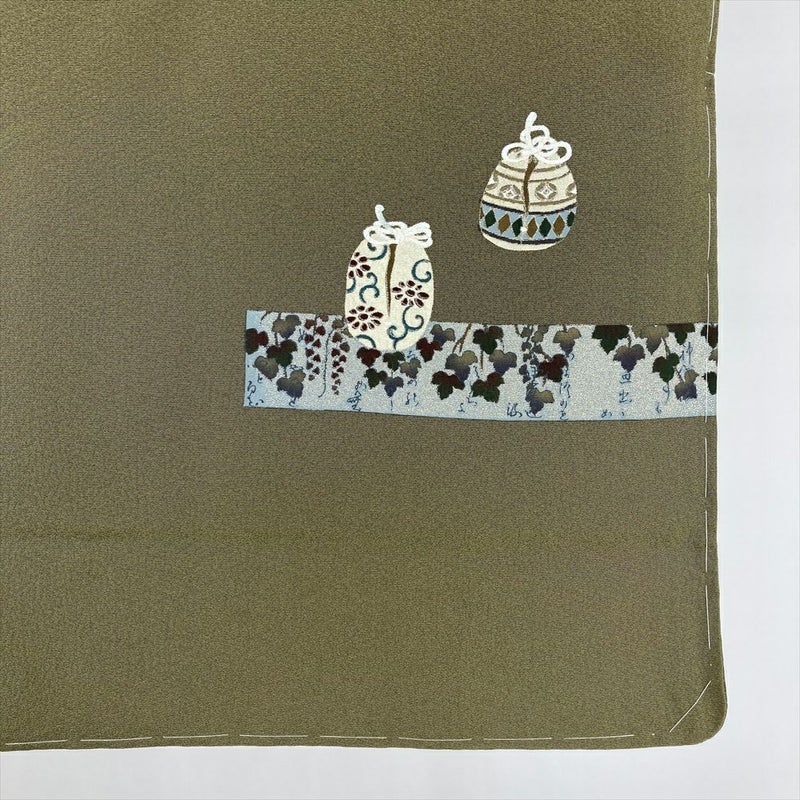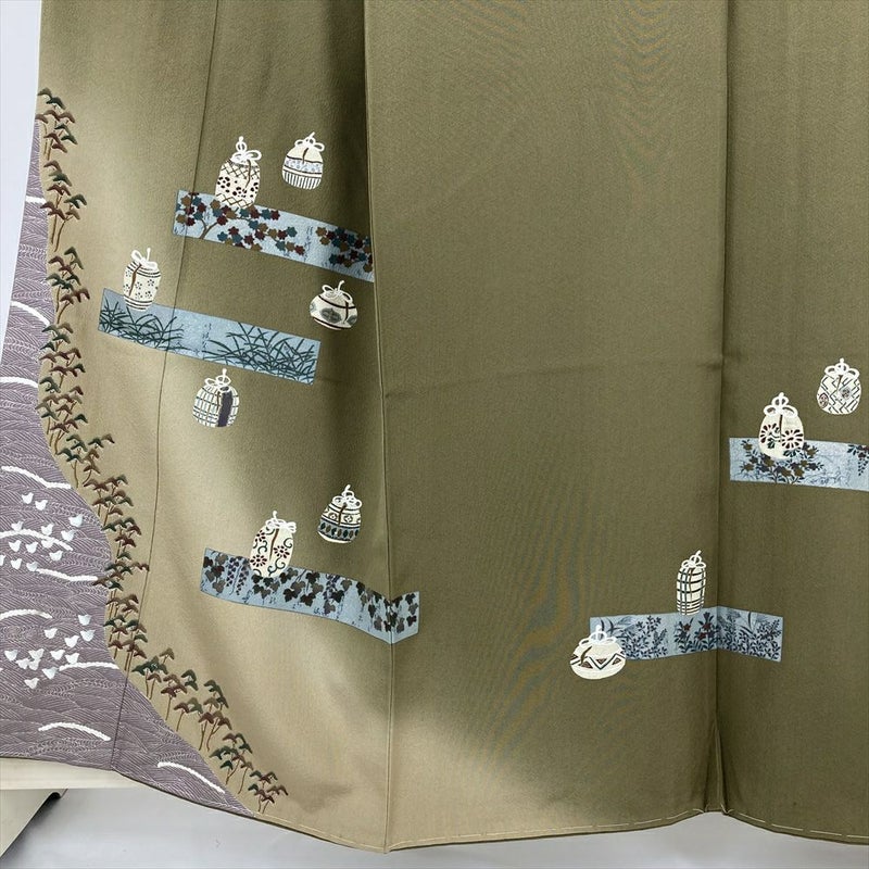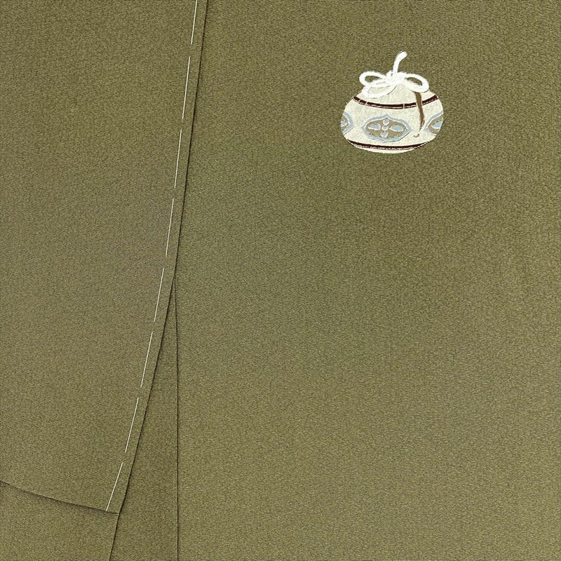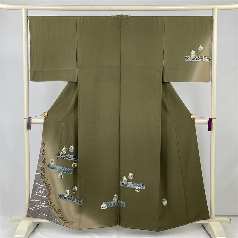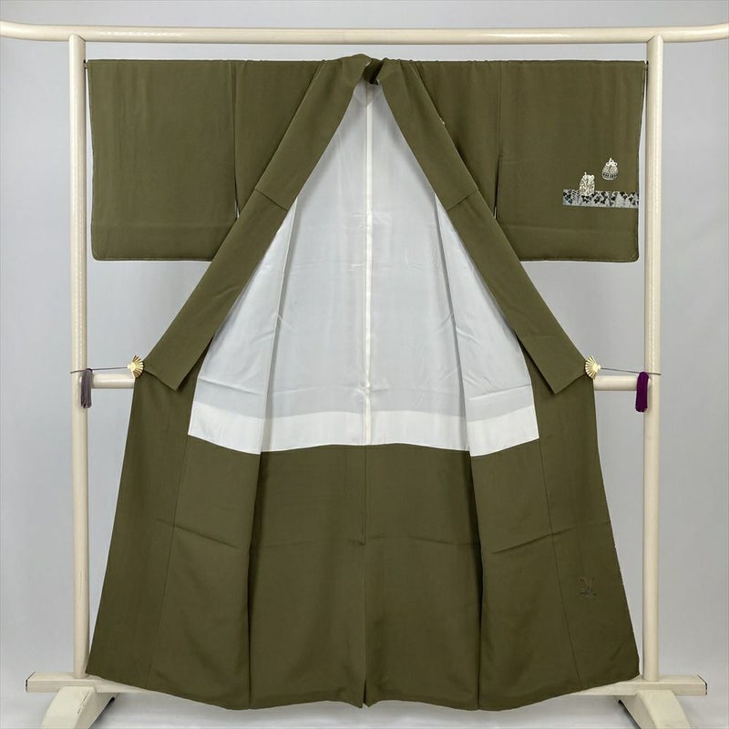 (中古) 訪問着 カーキ 緑 セミフォーマル 棗文様 袷 絹【身丈】152.5cm【裄丈】68.5cm