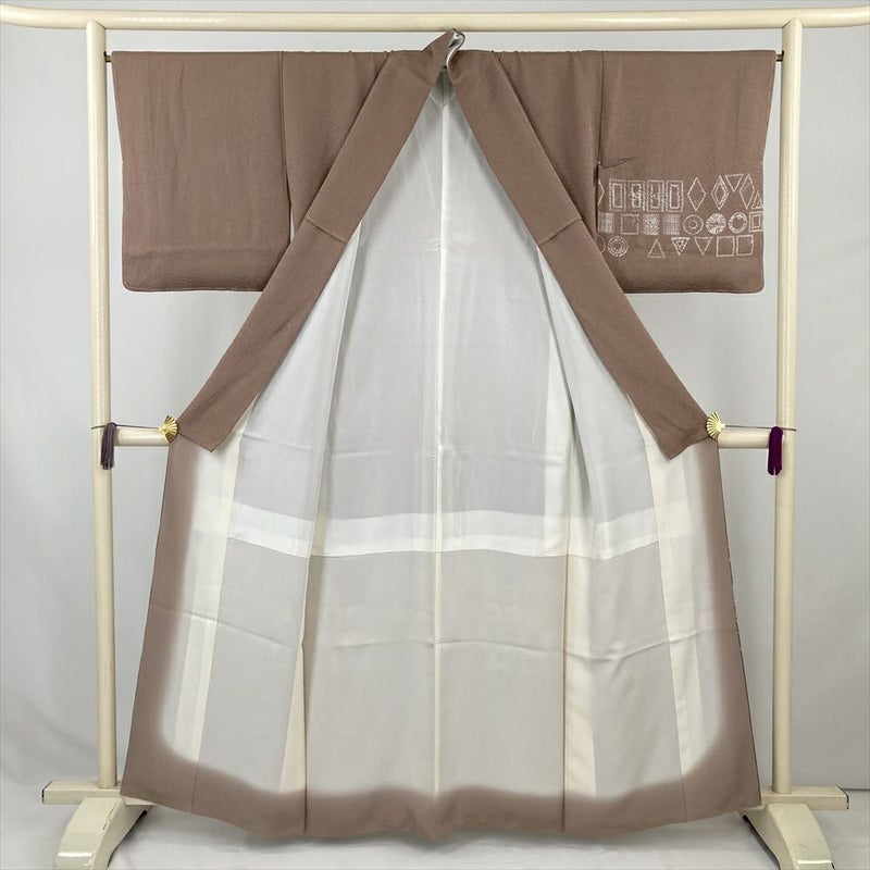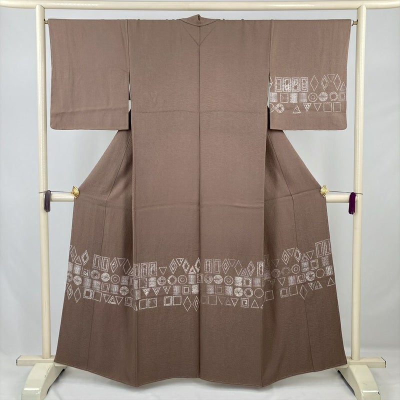 (中古) 訪問着 薄茶 セミフォーマル 図形文様 袷 絹【身丈】155cm【裄丈】66.5cm