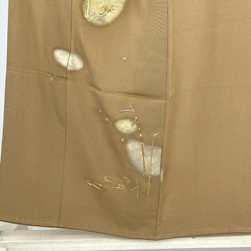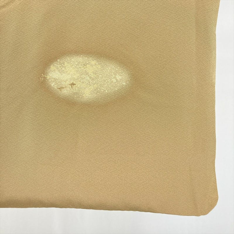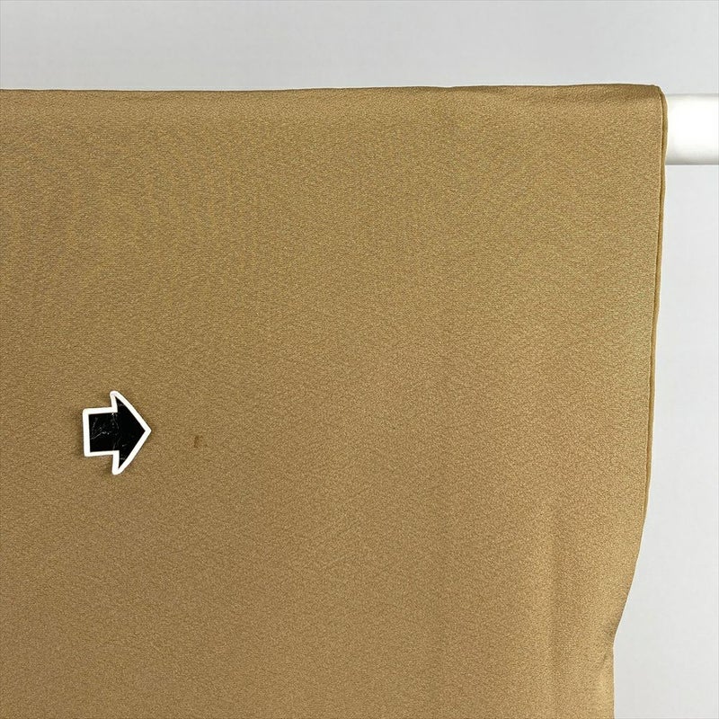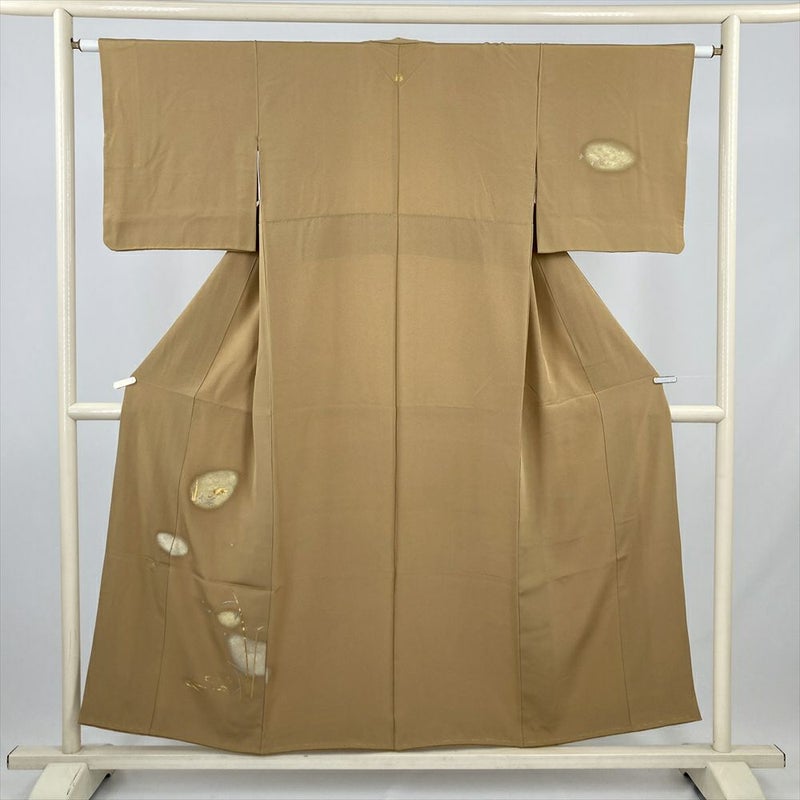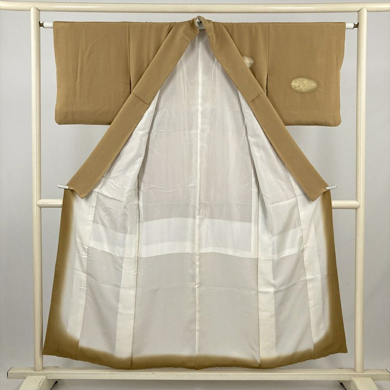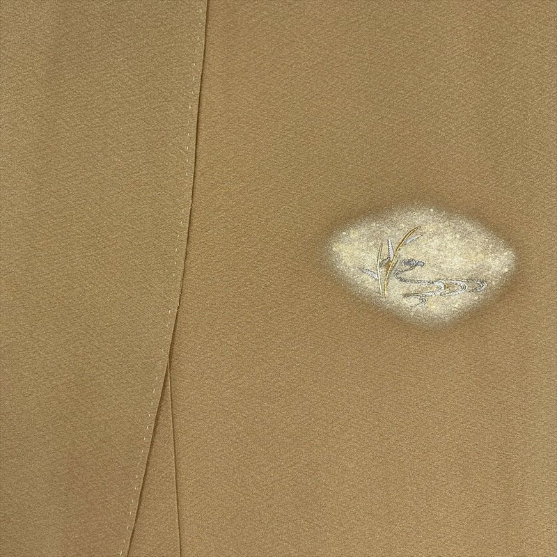 やわらかな縮緬地に、薄い黄み寄りの茶色が穏やかに広がる付け下げです。