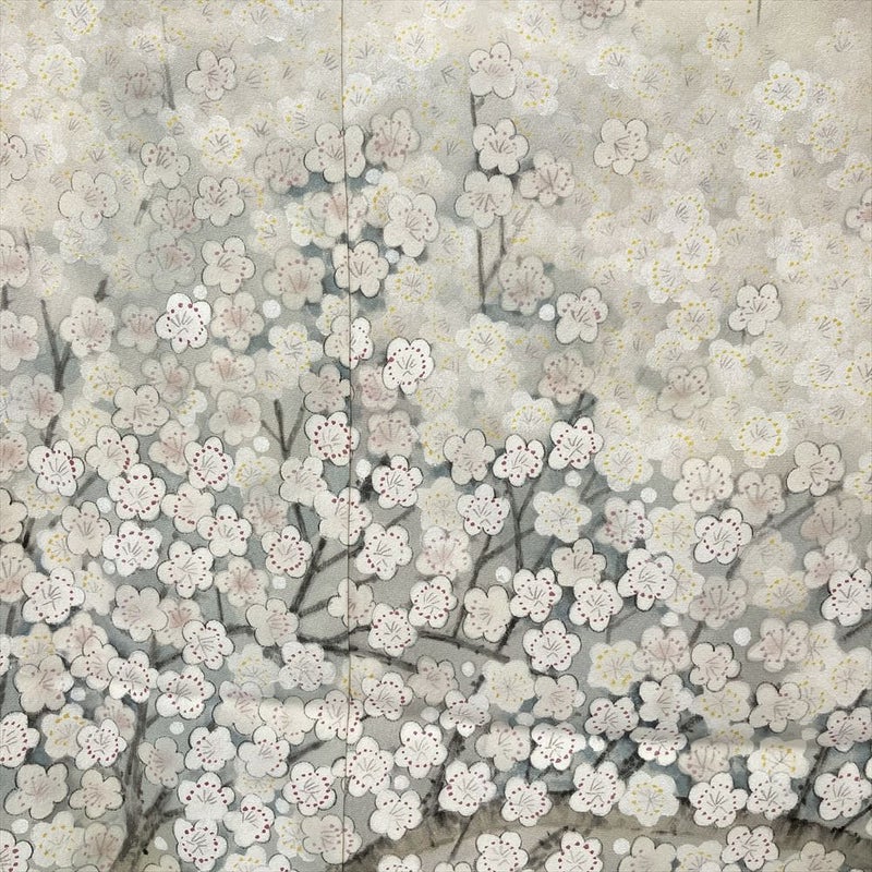 ふっくらとしたシボが特徴の縮緬(ちりめん)地に、春の訪れを告げる満開の白梅が美しく染められています。その染めの技法は非常に細やかで、まるで本物の花が咲いているかのような、はっとする美しさがあります。上質な縮緬の生地は、しっとりと体に馴染み、着姿をより一層美しく見せてくれます。