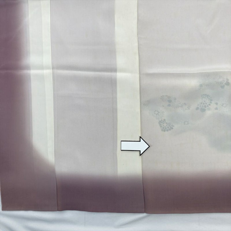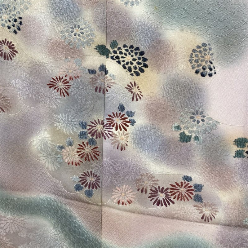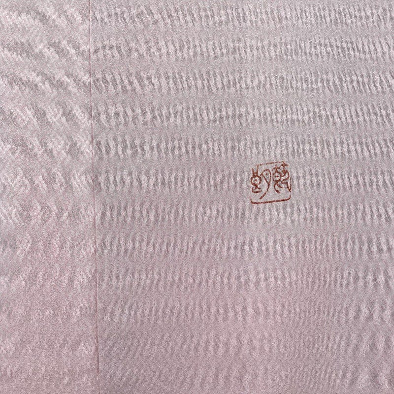 古典的な道長取りの地紋に、長寿を意味する吉祥文の菊が美しく描かれています。その染めの技法は非常に細やかで、見る角度によって柄が浮き立つように見え、着物全体に奥行きを与えます。吉祥文が描かれたこの訪問着は、お祝いの席にもふさわしい格調高い一枚です。
