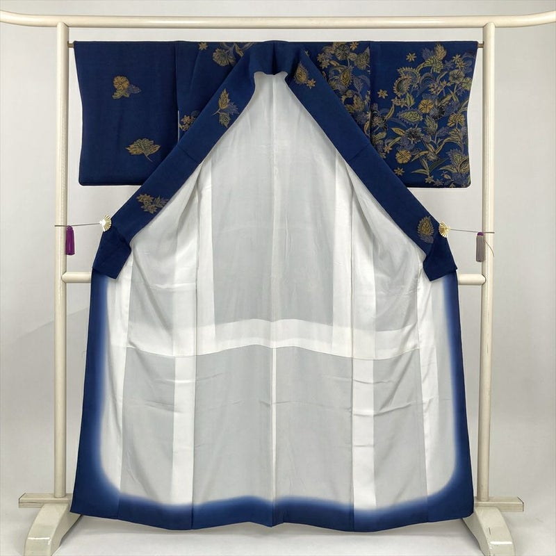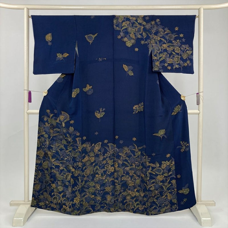 (中古) 付下 紺 セミフォーマル 草花 袷 絹【身丈】159cm【裄丈】66cm