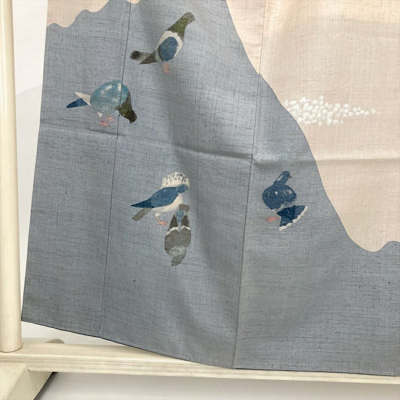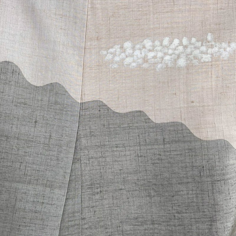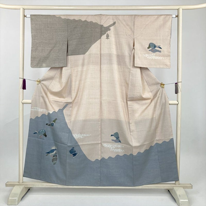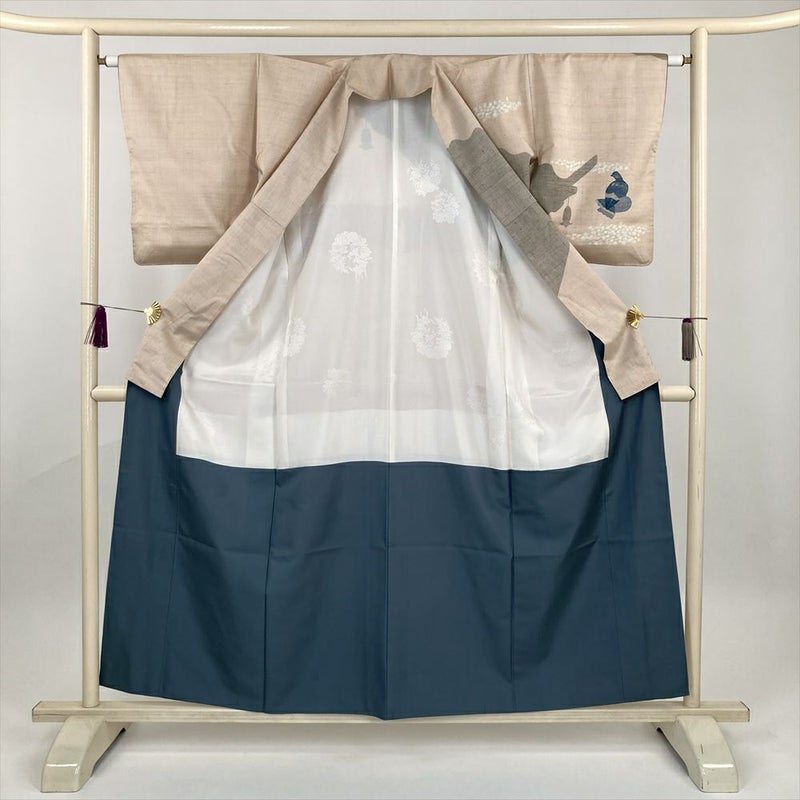 (中古) 紬訪問着 白茶 灰青 クリーム 生成 カジュアル セミフォーマル 鳩 袷 絹【身丈】152cm【裄丈】63cm