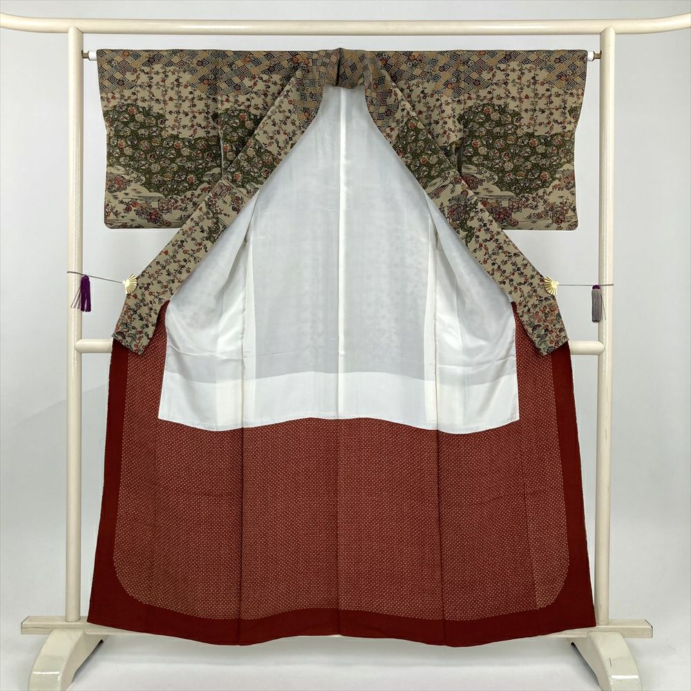 (中古) 訪問着 茶緑 カジュアル 貝桶 四季花 袷 絹【身丈】154cm【裄丈】64.5cm