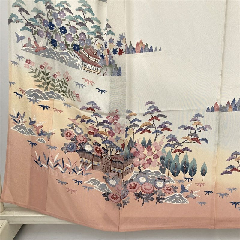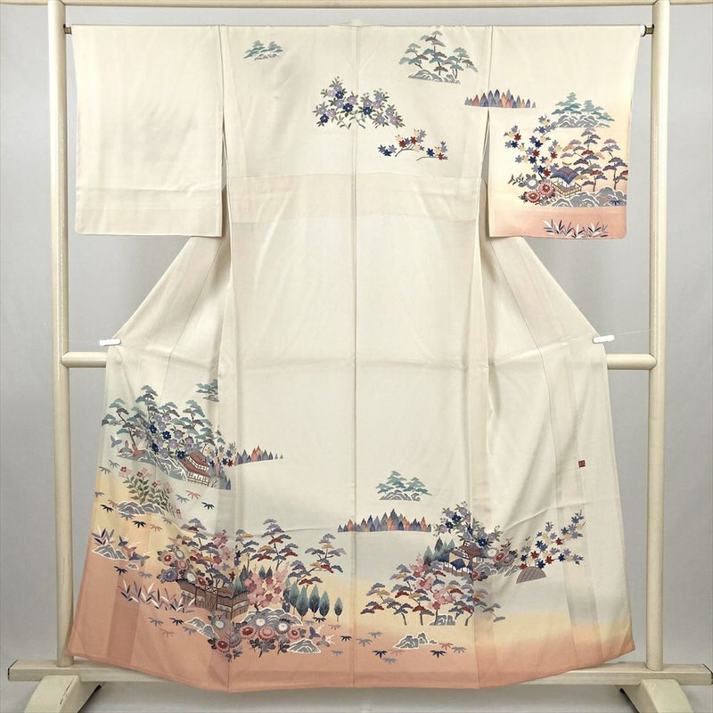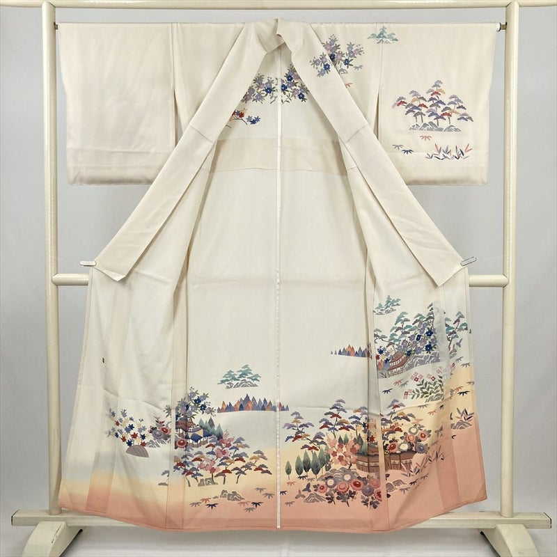 (中古) 訪問着 アイボリー 生成り セミフォーマル 風景文 単衣 絹【身丈】152.5cm【裄丈】67cm