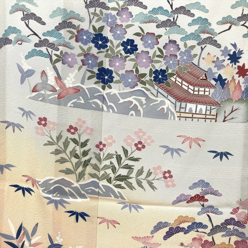 象牙色のやわらかな縮緬地に、風景文が静かに描かれた上品な単衣の訪問着です。