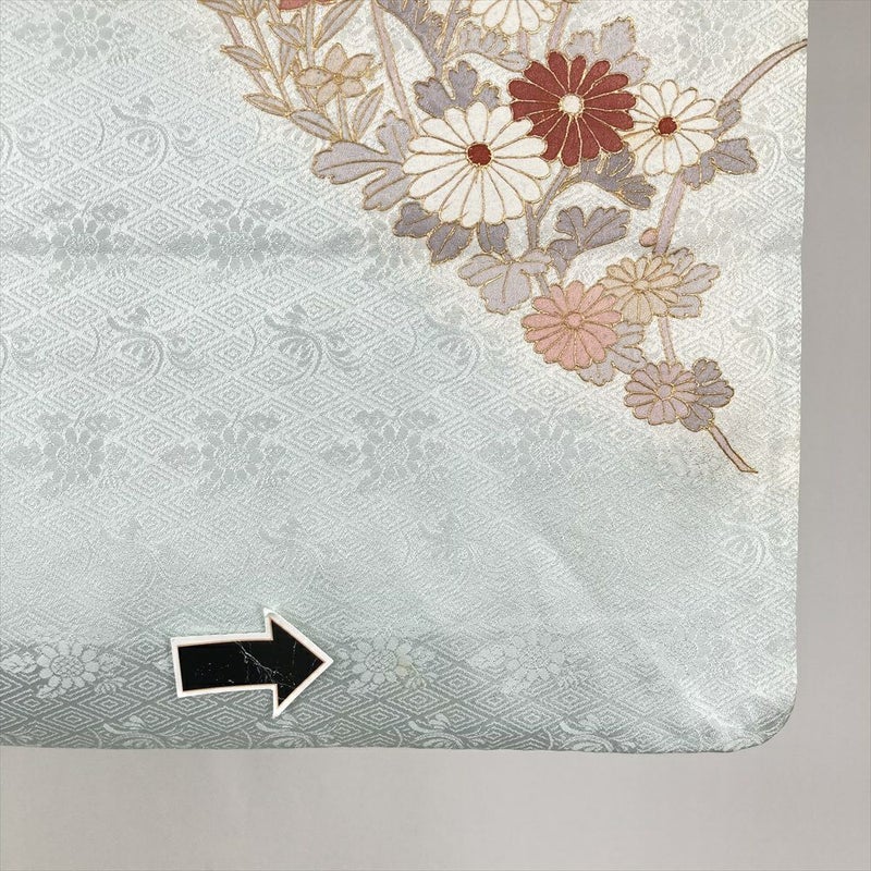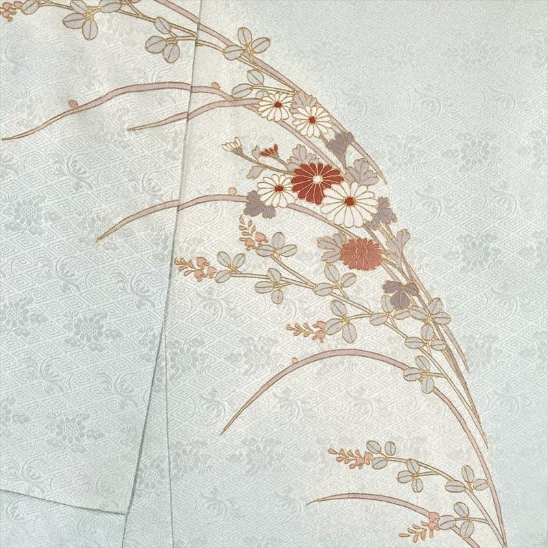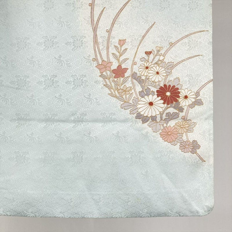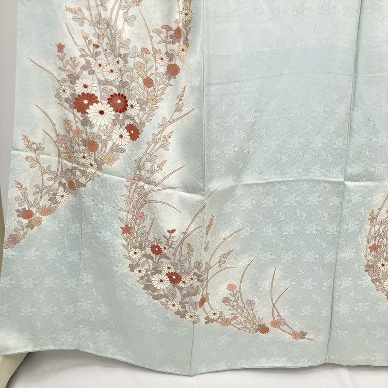 <div class=爽やかなアイスブルーの地色に、秋の草花が優雅に描かれた訪問着です。