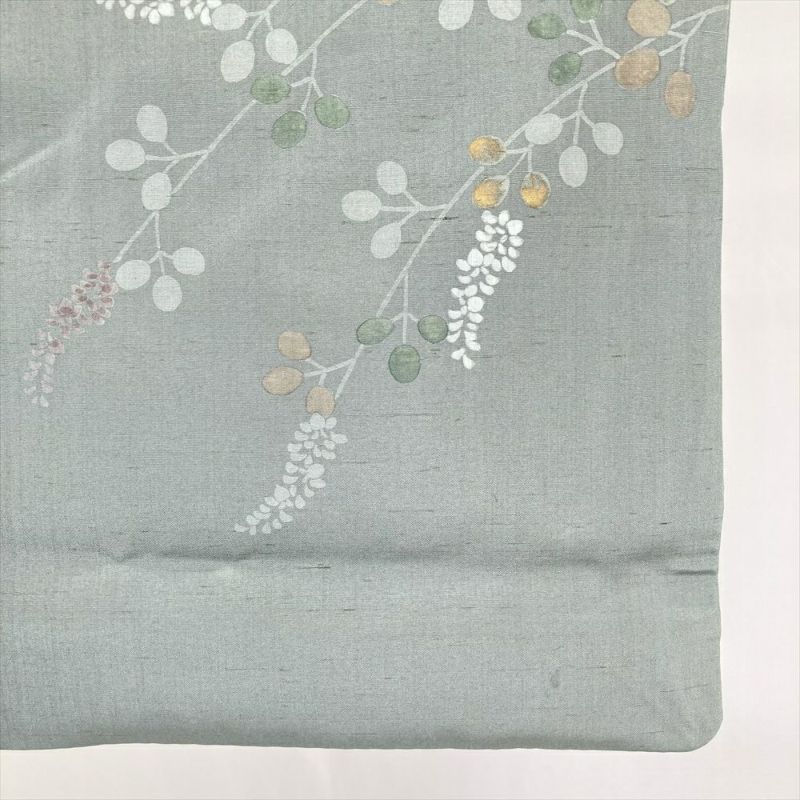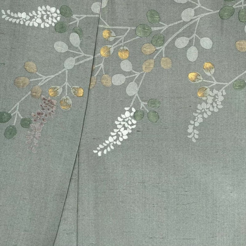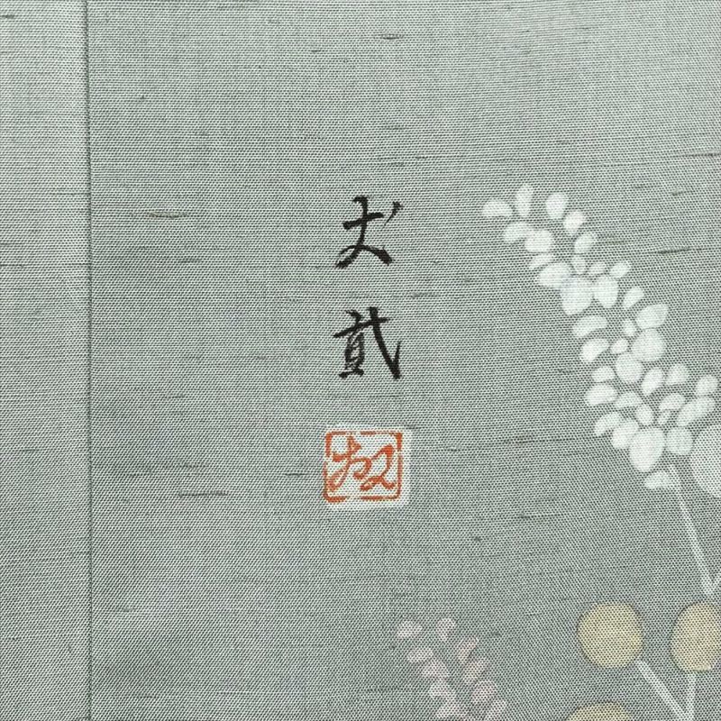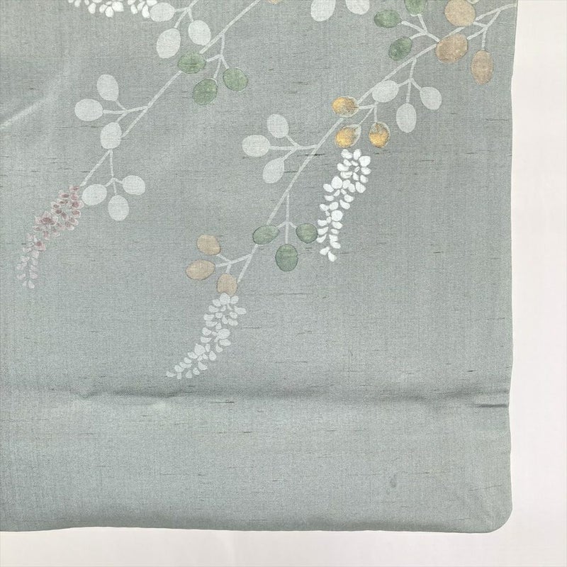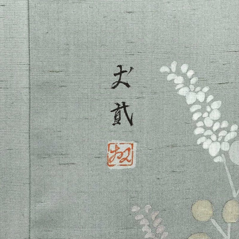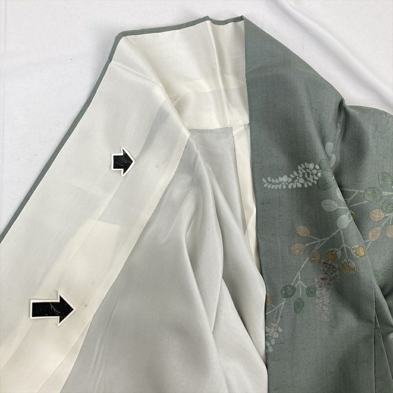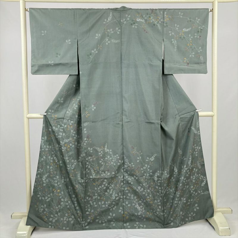 (中古) 訪問着 灰緑 くすみグリーン セミフォーマル 紬地 染め 萩 袷 絹【身丈】160.5cm【裄丈】65.5cm