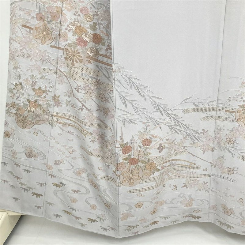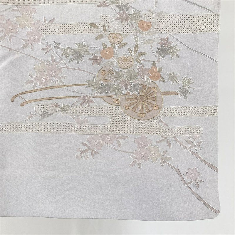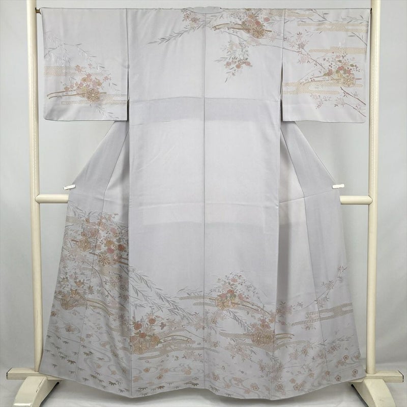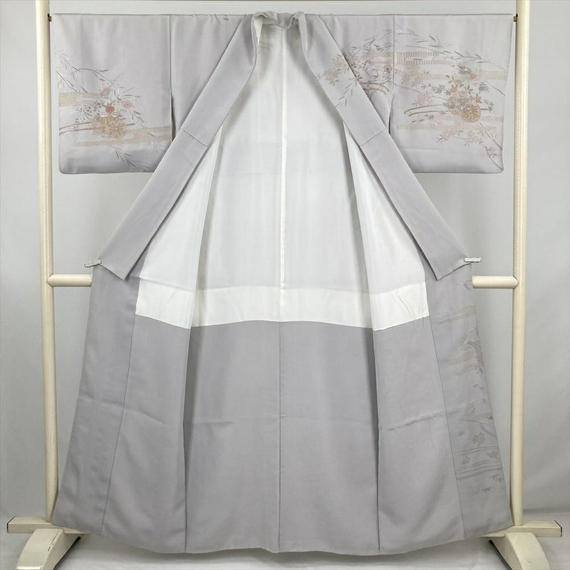 (中古) 訪問着 薄灰 グレー セミフォーマル 汕頭刺繍 花車 霞 流水 袷 絹【身丈】152.5cm【裄丈】67cm