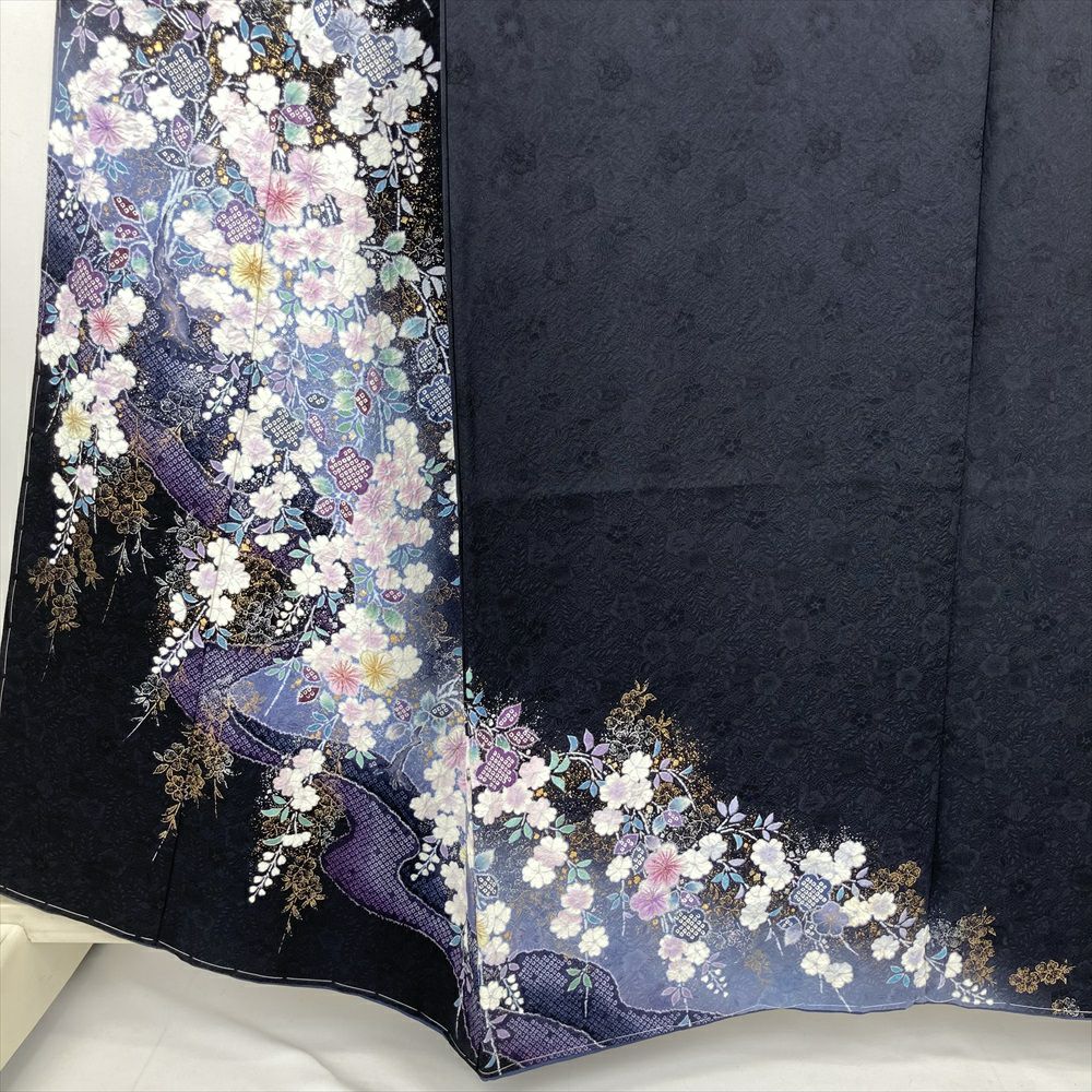 深みのある濃紺地に、絞りと染めで描かれた辻が花が幻想的に浮かぶ訪問着。