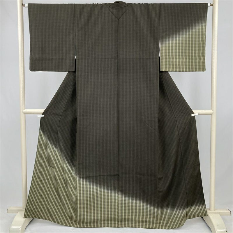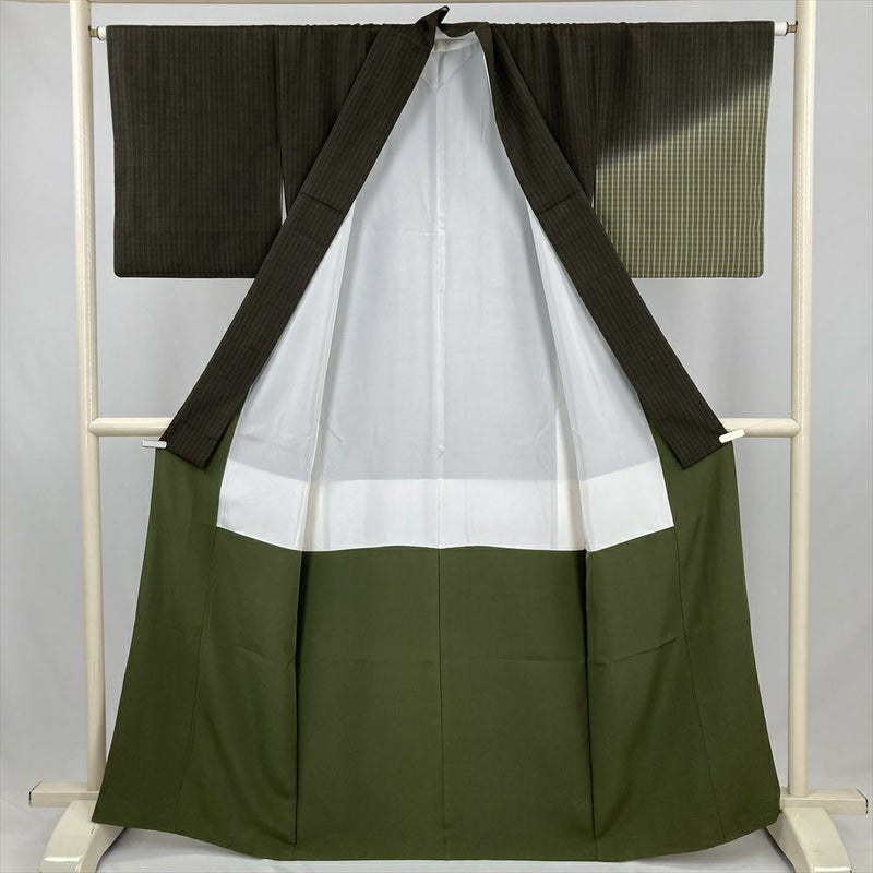 (中古) 訪問着 深緑 カジュアル 格子柄の織り 裾ぼかし 袷 絹【身丈】158cm【裄丈】65.5cm