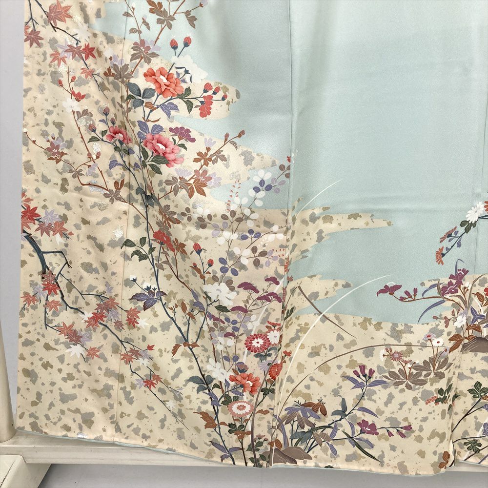 (中古) 訪問着 水色 ミントグリーン フォーマル 四季花 金彩 袷 絹 【身丈】150cm【裄丈】64cm