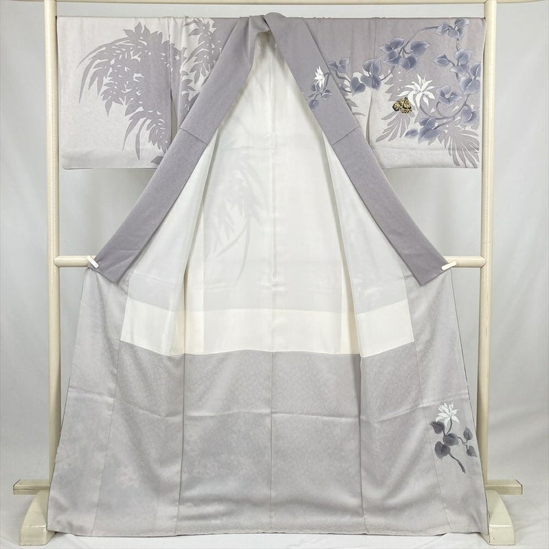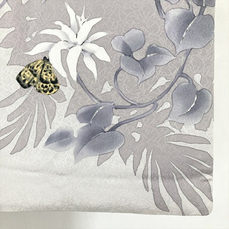 (中古) 訪問着 薄灰 グレー セミフォーマル 蘭 蝶 袷 絹【身丈】165cm【裄丈】71cm