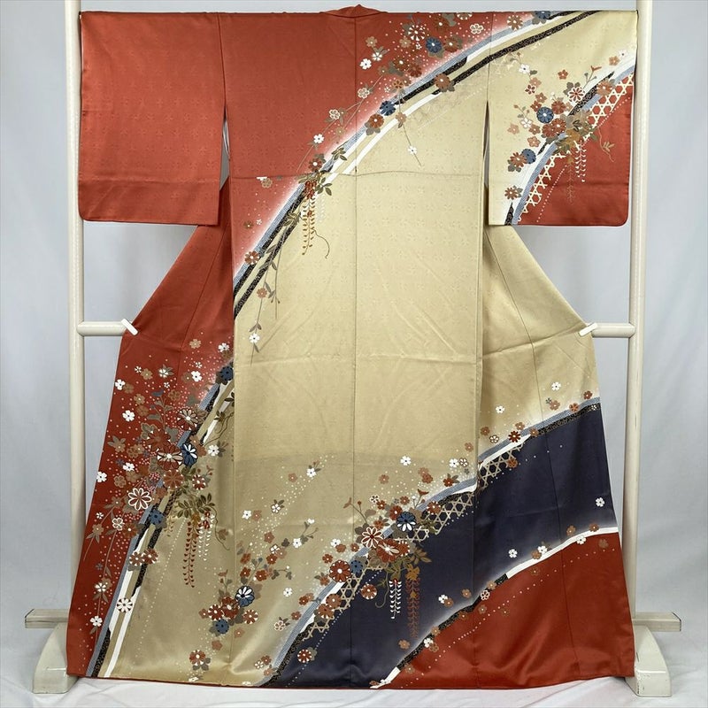(中古) 訪問着 薄赤茶 臙脂 セミフォーマル 春秋花文 袷 絹【身丈】164cm【裄丈】70cm