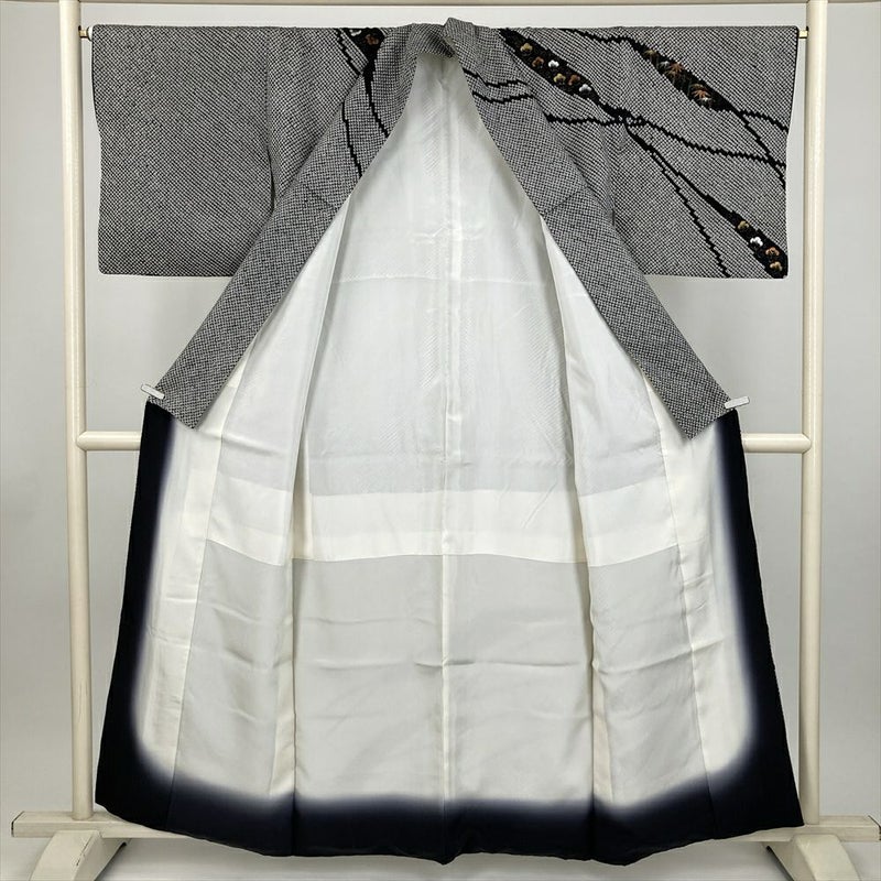 (中古) 訪問着 黒 白 セミフォーマル 鹿の子絞り 梅 笹 袷 絹【身丈】154cm【裄丈】67.5cm