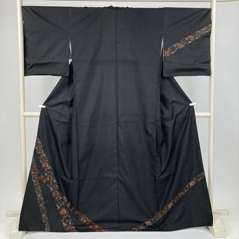 (中古) 訪問着 黒 セミフォーマル 紬地 刺繍 天平 花草文 袷 絹 【身丈】162cm【裄丈】70cm