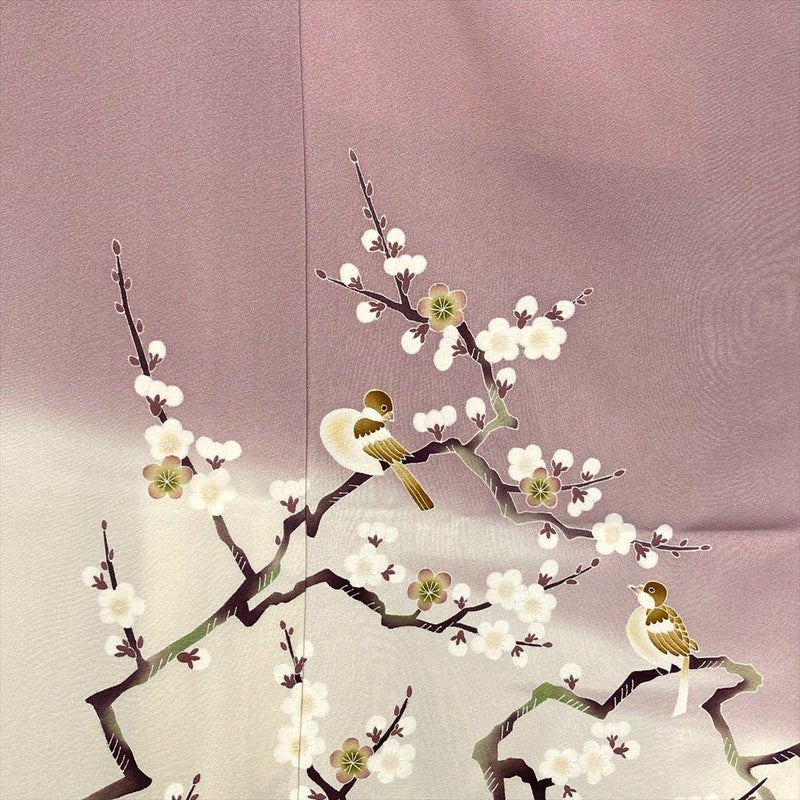 (中古) 訪問着 ピンクグレー セミフォーマル 縮緬 花鳥 袷 絹 【身丈】167cm【裄丈】71cm