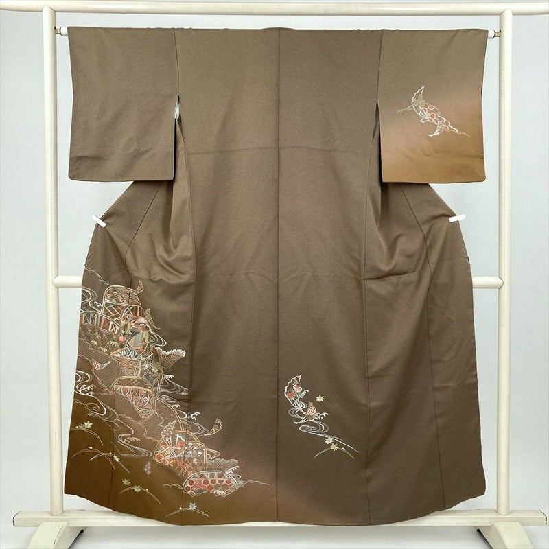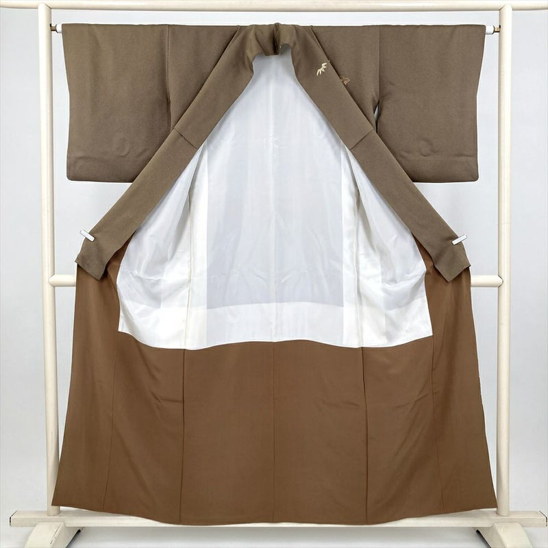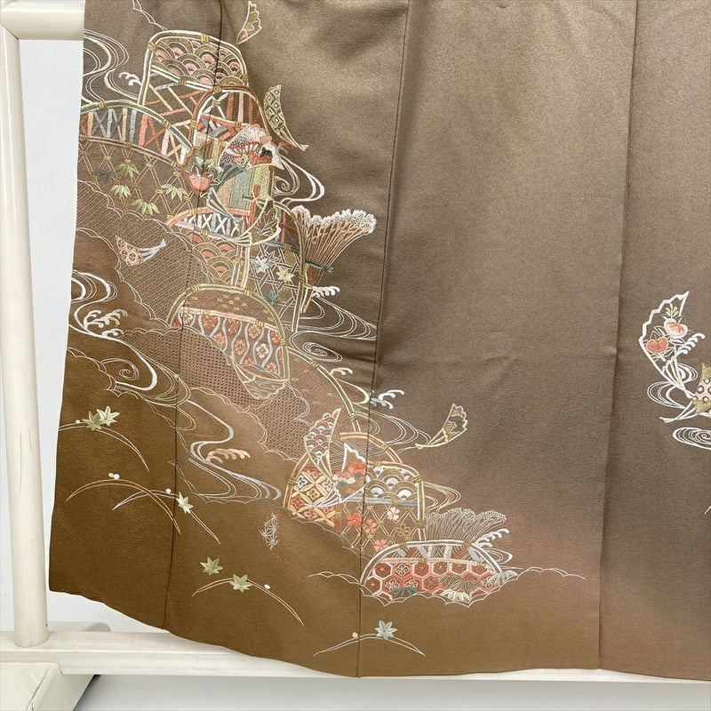 (中古) 訪問着 茶 セミフォーマル 刺繍 四季花 玉袖垣 扇子 袷 絹 【身丈】150.5cm【裄丈】65.5cm