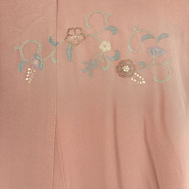 (中古) 訪問着 灰橙 ピンク セミフォーマル 縮緬 刺繍 華文 風景文 袷 絹 【身丈】167cm【裄丈】71.5cm