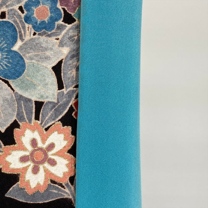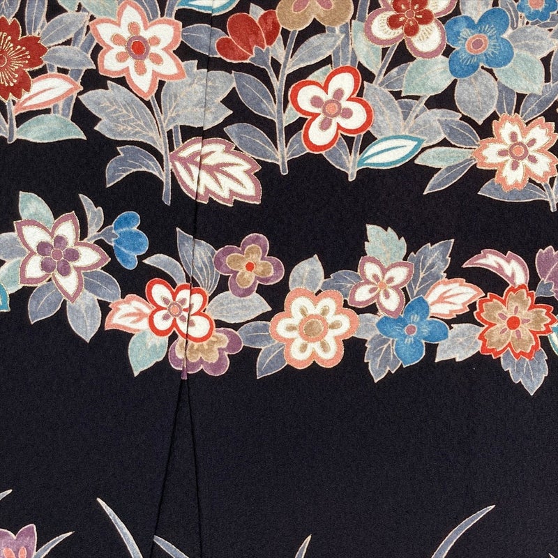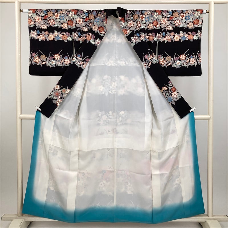 (中古) 訪問着 墨黒 セミフォーマル 花草文 袷 絹 【身丈】152cm【裄丈】63cm