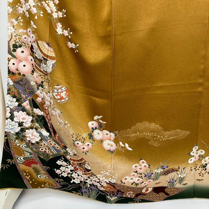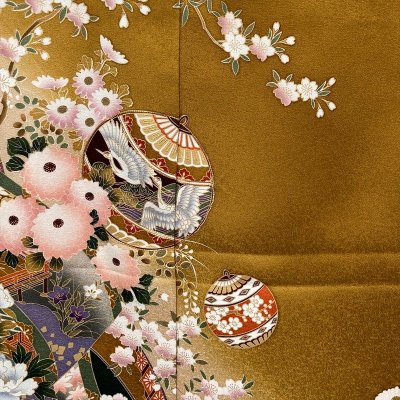 正絹の柔らかな光沢に、四季折々の花々と可愛らしい鞠、そして人と人を結ぶ縁起物とされる「熨斗」が美しく流れるように描かれています。
