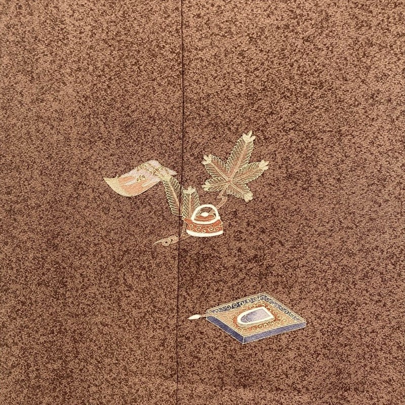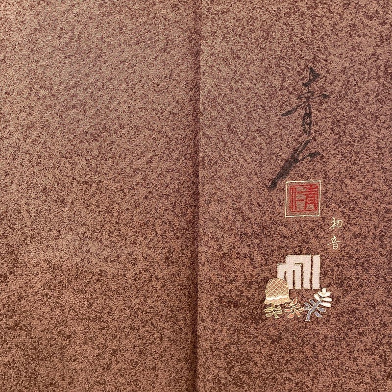 シボの豊かな縮緬地に、若松や松ぼっくりに加え、硯(すずり)や源氏香といった「文人(ぶんじん)」の趣味を思わせる高潔な図案が配されています。