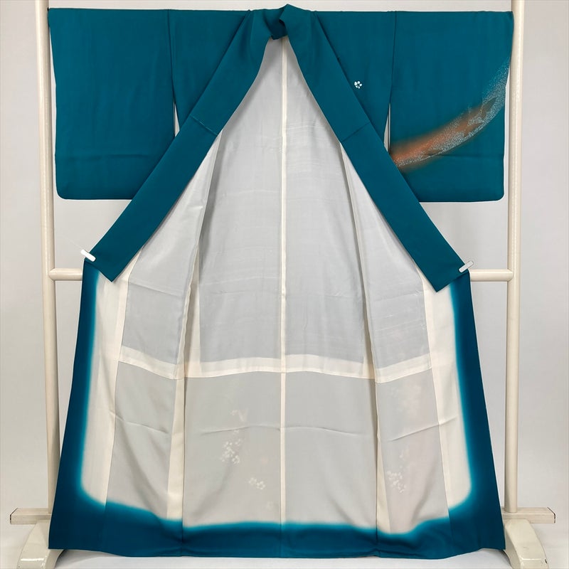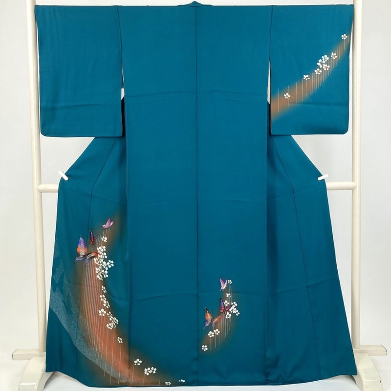 (中古) 訪問着 青緑 孔雀色 セミフォーマル 蝶 桜 袷 絹 【身丈】164.5cm【裄丈】67.5cm