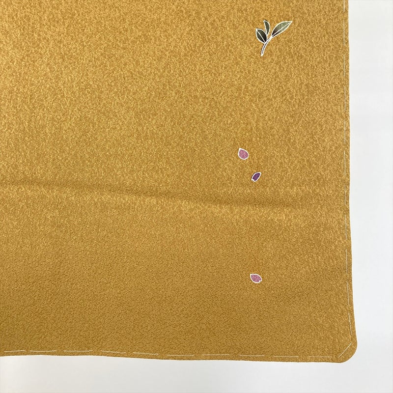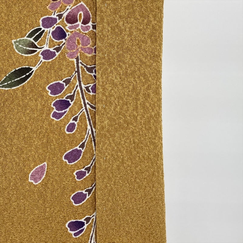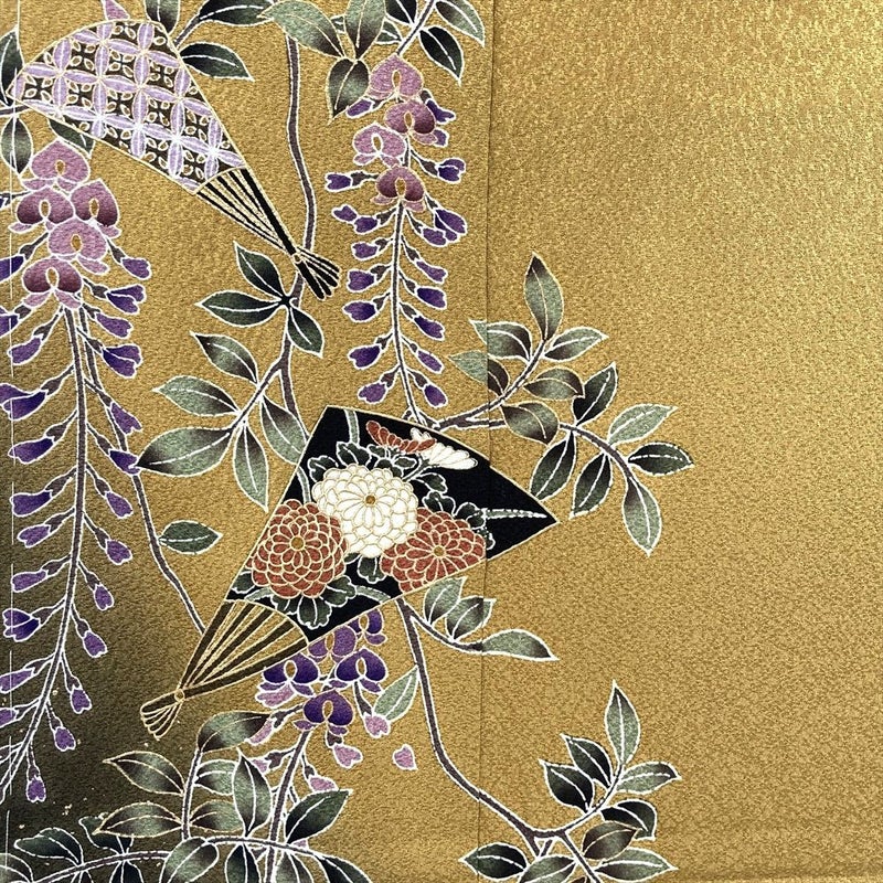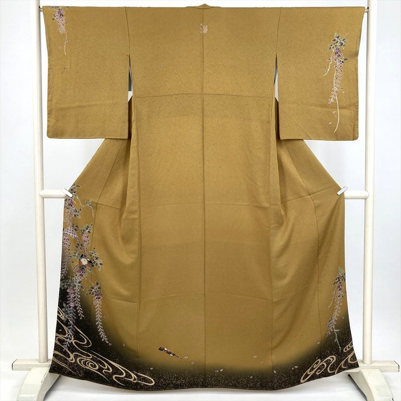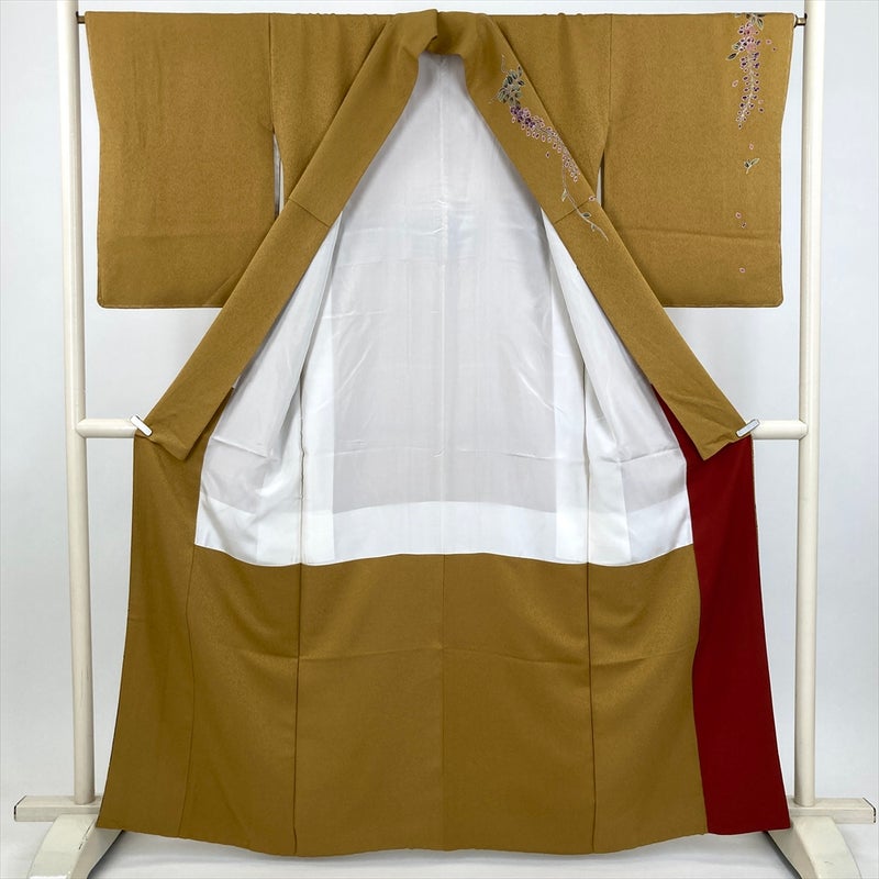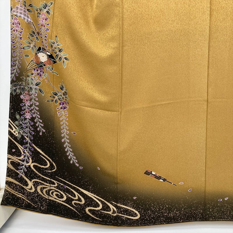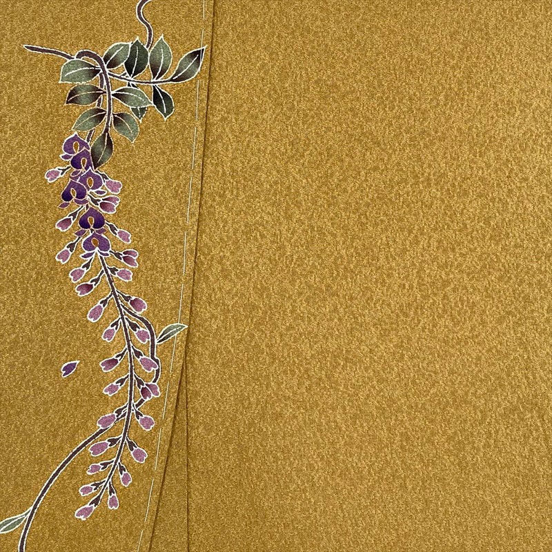 落ち着いた芥子色地に、藤の花と扇、流水文様を配した気品ある訪問着。