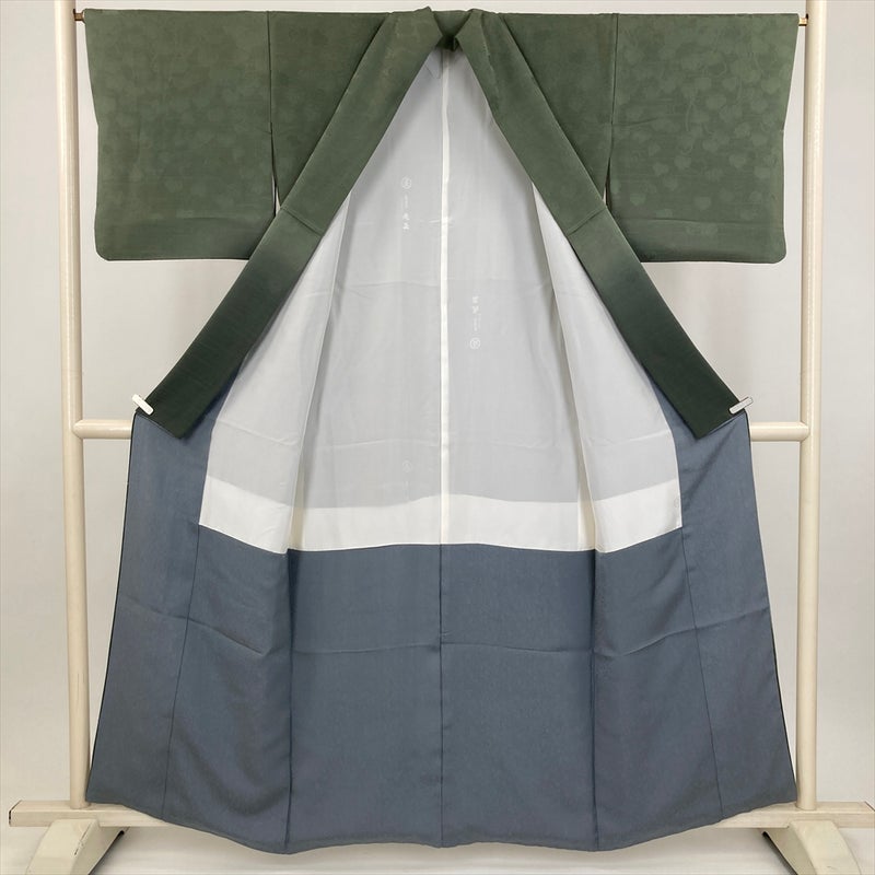 (中古) 訪問着 灰緑 セミフォーマル 葡萄 ぼかし 地紋織り 袷 絹 【身丈】154.5cm【裄丈】66cm