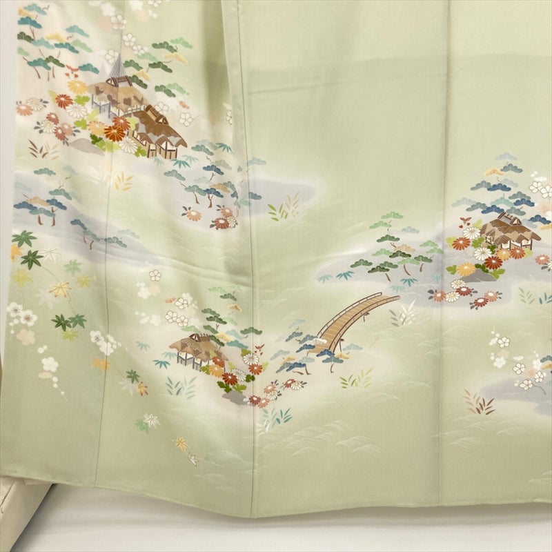 心洗われるような清雅な薄黄緑の地に、名門・千總ならではの繊細な筆致で松竹梅や菊、風情ある家屋を描き出した、芸術品のように美しい訪問着です。