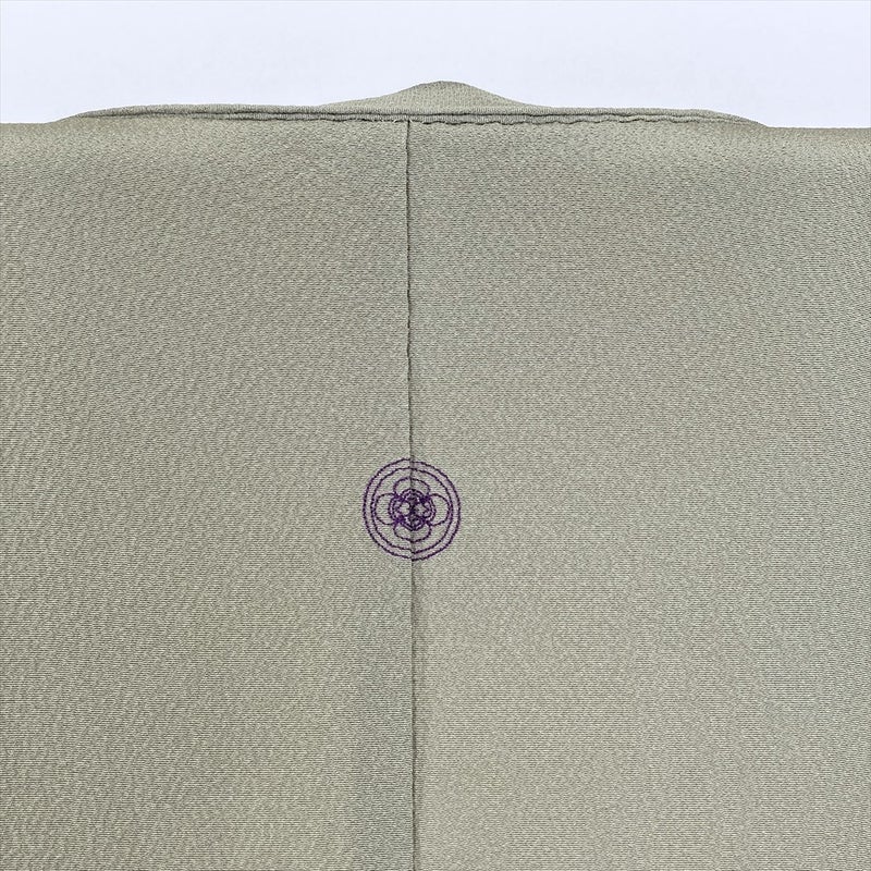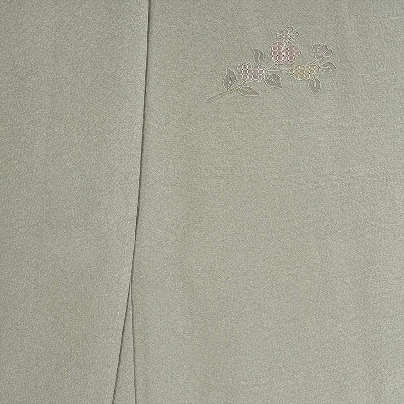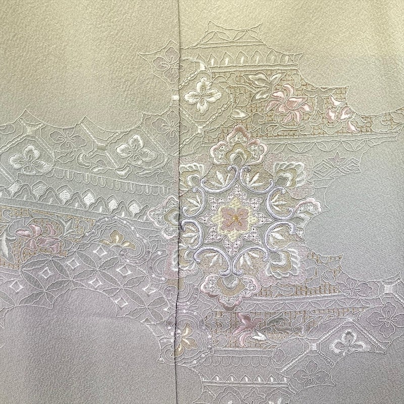 渋みのある薄柳色地に、刺繍の華紋と七宝・華菱の吉祥柄を配した、落ち着きと格調を感じさせる訪問着。