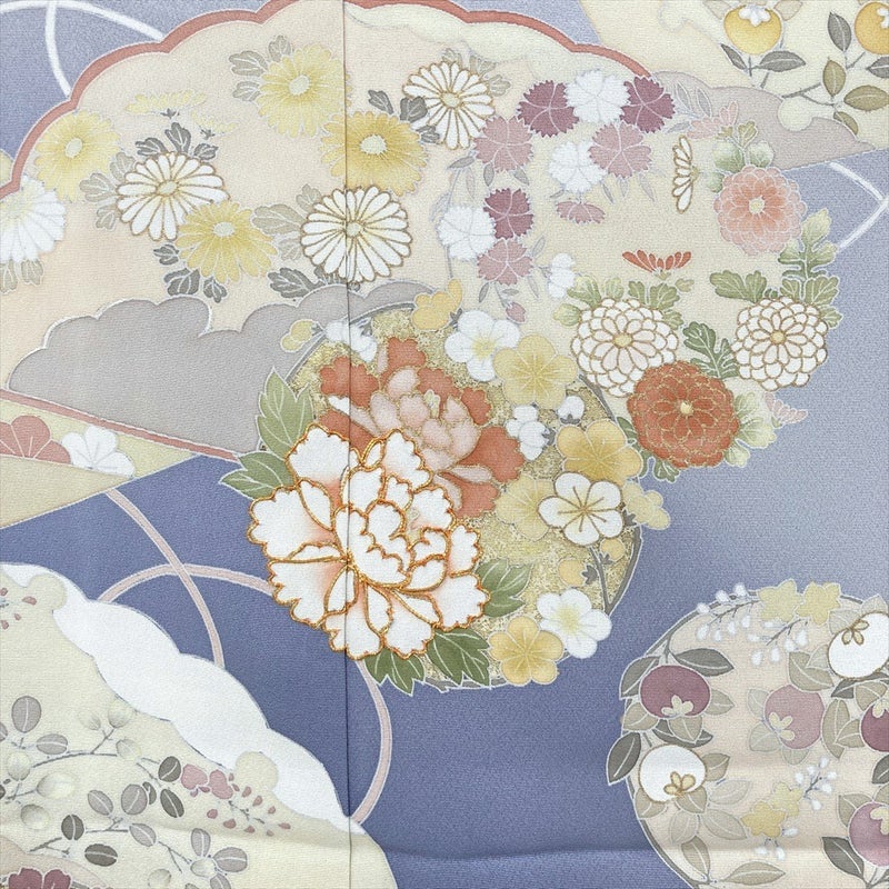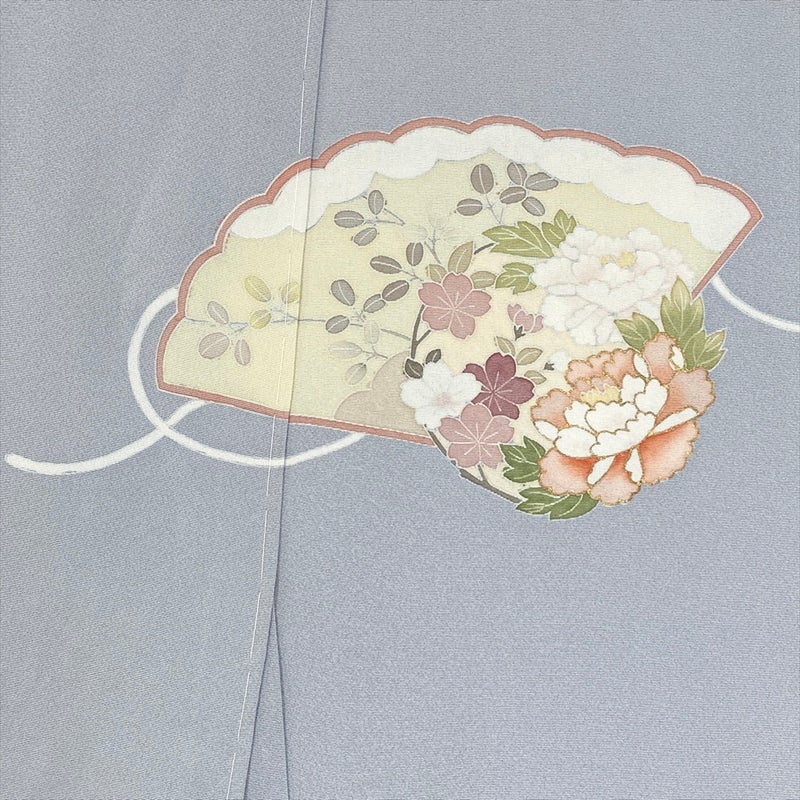 上品な薄灰青色地に、末広がりの意味を持つ扇文と花丸紋を配した、気品漂う訪問着。