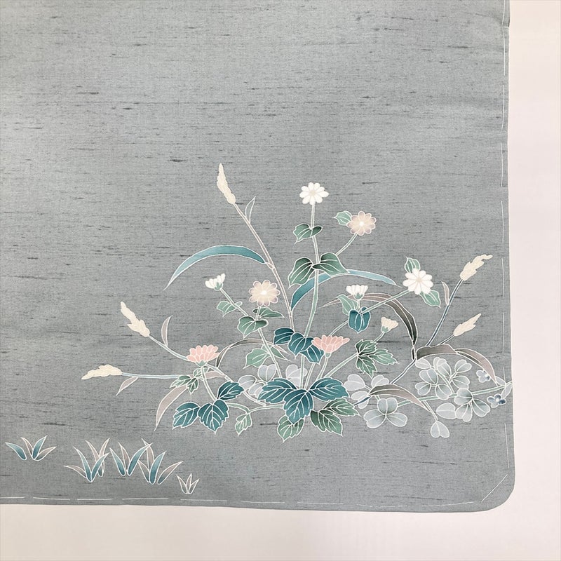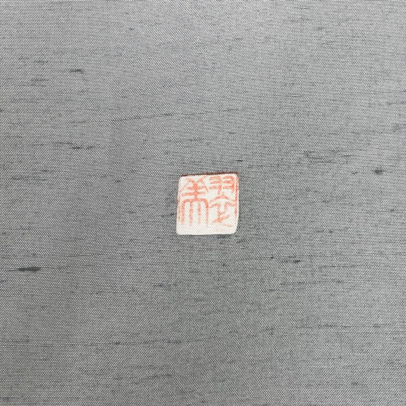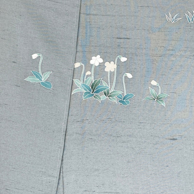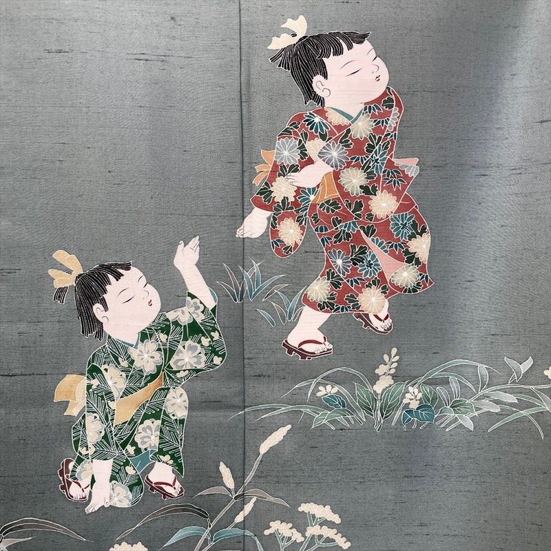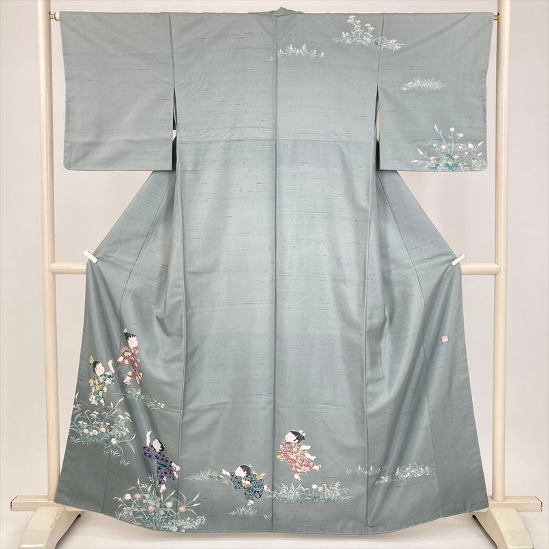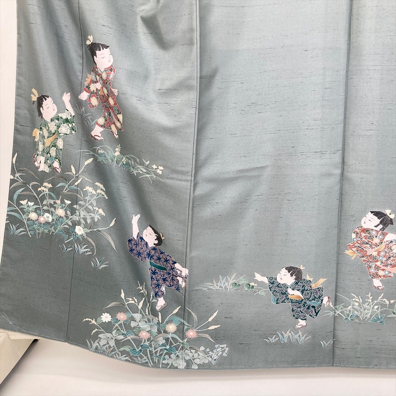 しっとりと落ち着いた灰緑の地色に、愛らしい童人形と瑞々しい草花を配した、物語を感じさせる紬訪問着です。