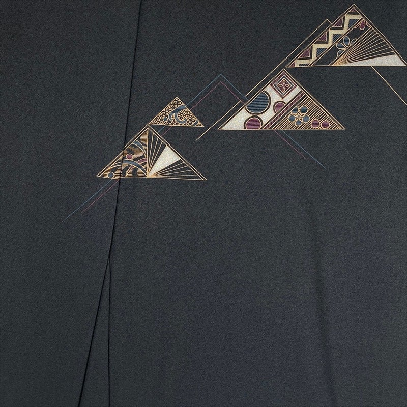 凛とした墨黒の地に、シャープな三角形の幾何学模様を緻密な刺繍で表現した、極めてモダンな訪問着です。